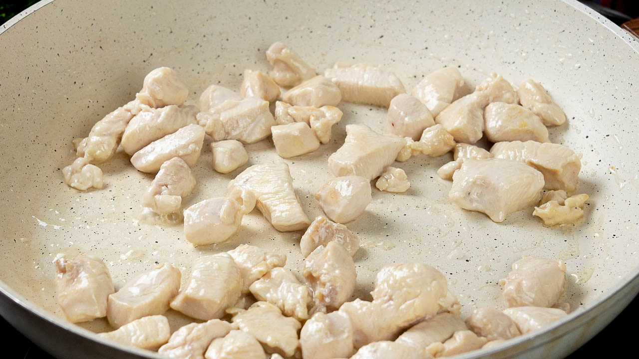 Heat oil in a pan over medium heat. Add the cubed chicken breast and season lightly with salt. Cook until the chicken is fully cooked.