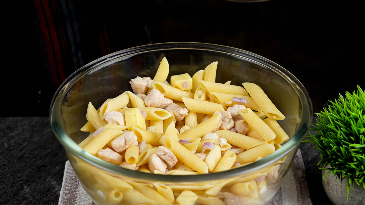 Add the cooked pasta to the bowl with the chicken and mix gently.