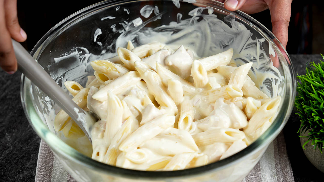 Pour the hot Alfredo sauce over the pasta mixture in the bowl. Mix thoroughly until everything is well coated.