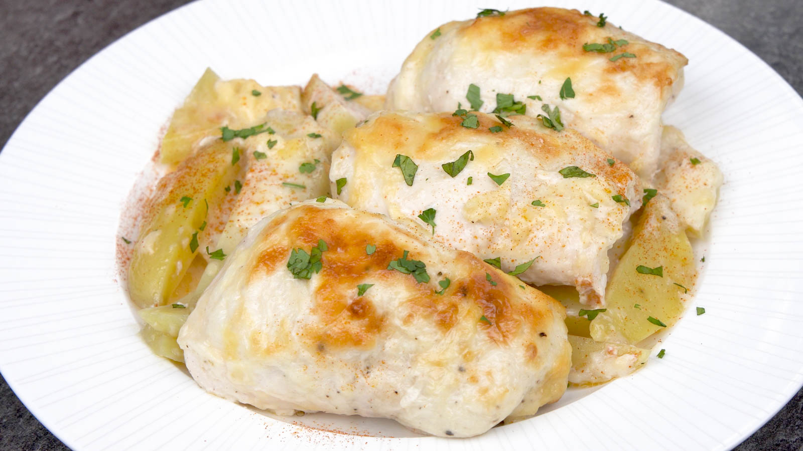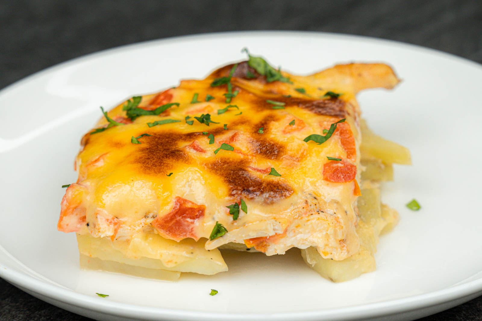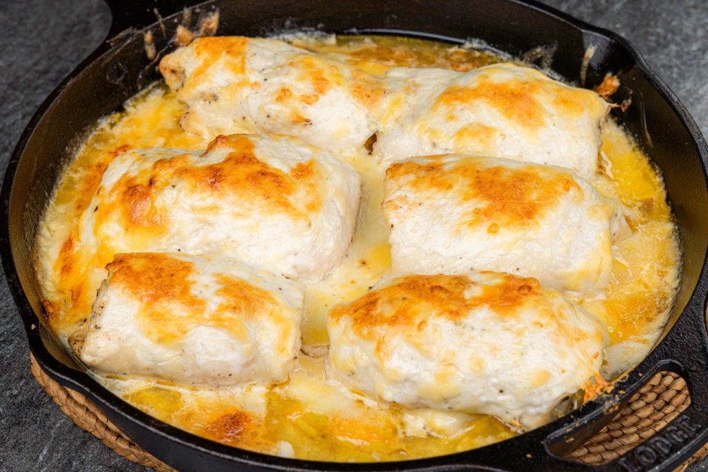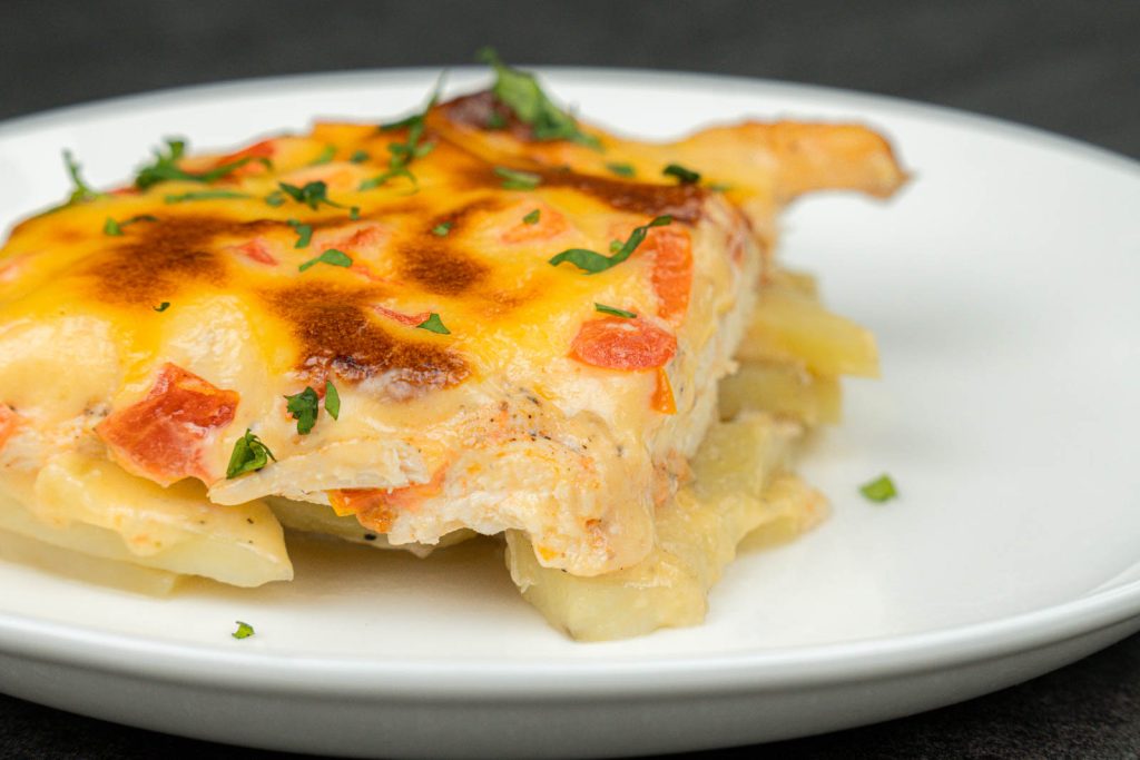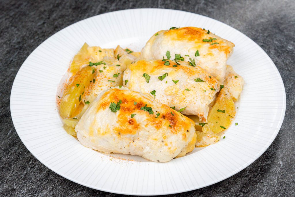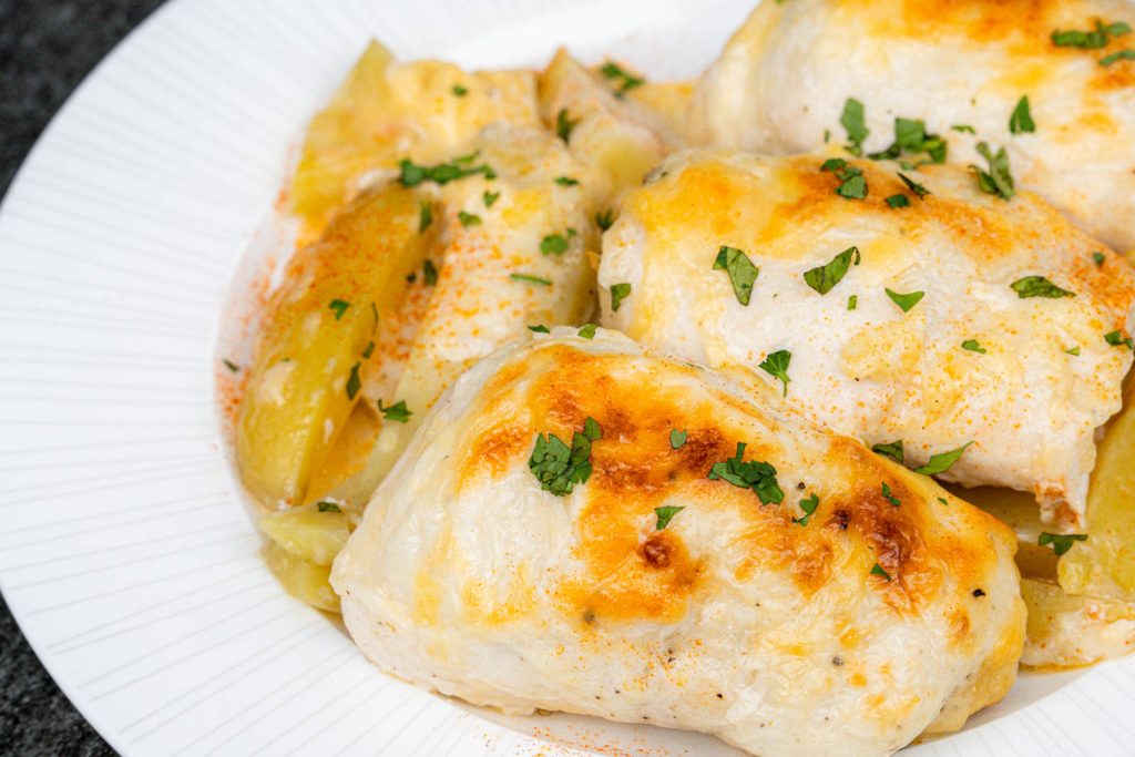 Slice the chicken, scoop up some cheesy potatoes, and serve immediately.