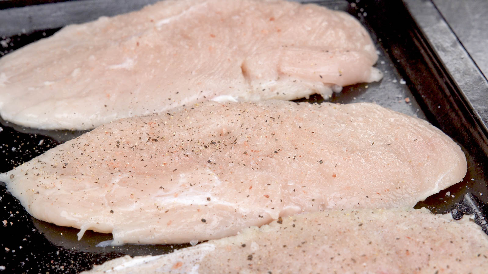 Season both sides of the chicken breast with ½ tsp salt, ¼ tsp black pepper, ½ tsp garlic powder, and ½ tsp sweet paprika.