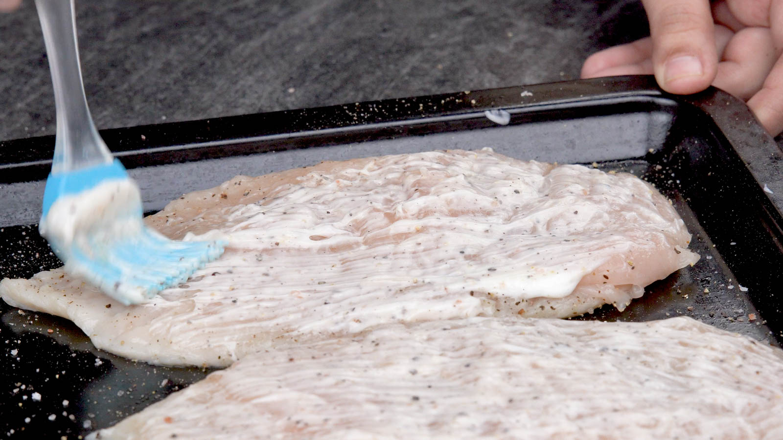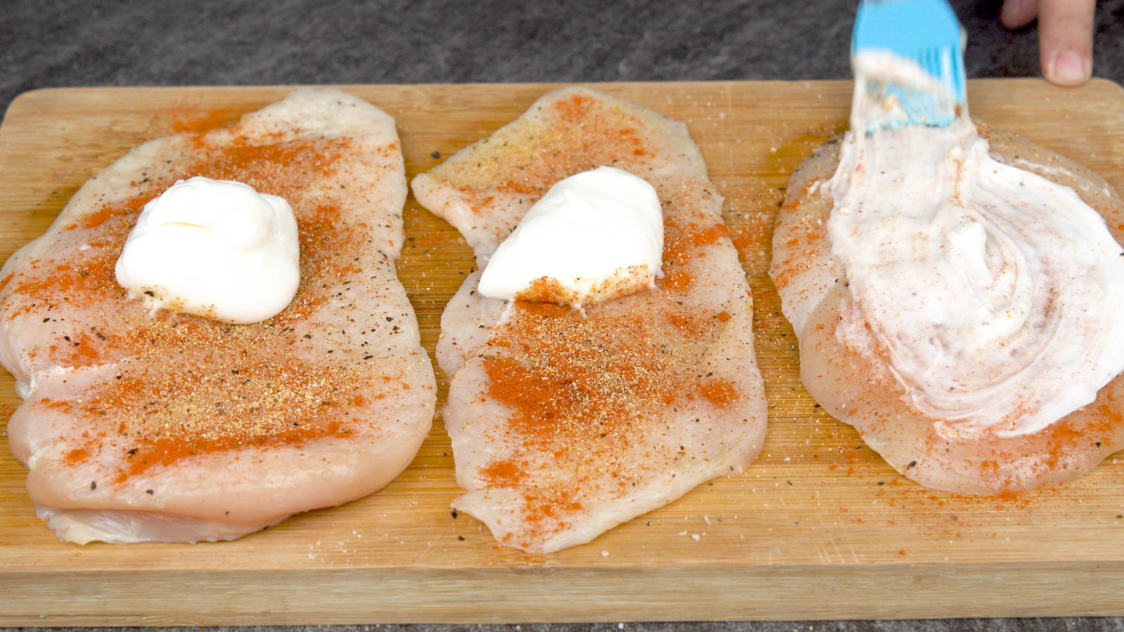 Spread 3 tsp of mayonnaise all over the chicken breast.