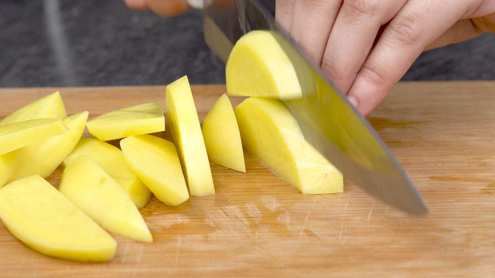 - Peel and thinly slice the potatoes.