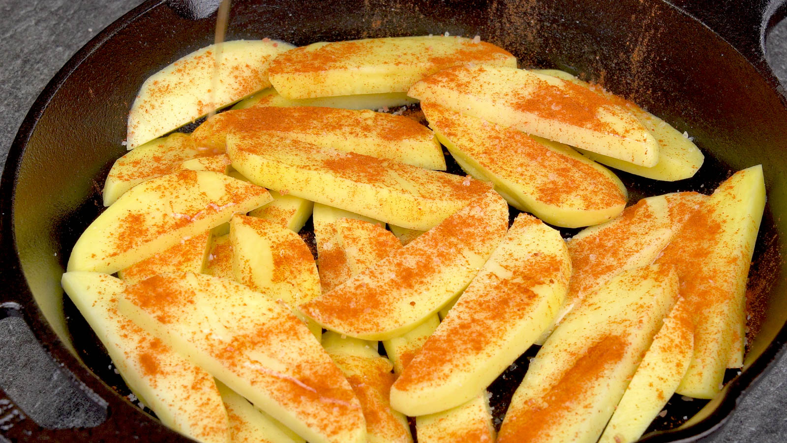 Keep potatoes in cold water for a minute to prevent browning, then pat dry well before cooking.