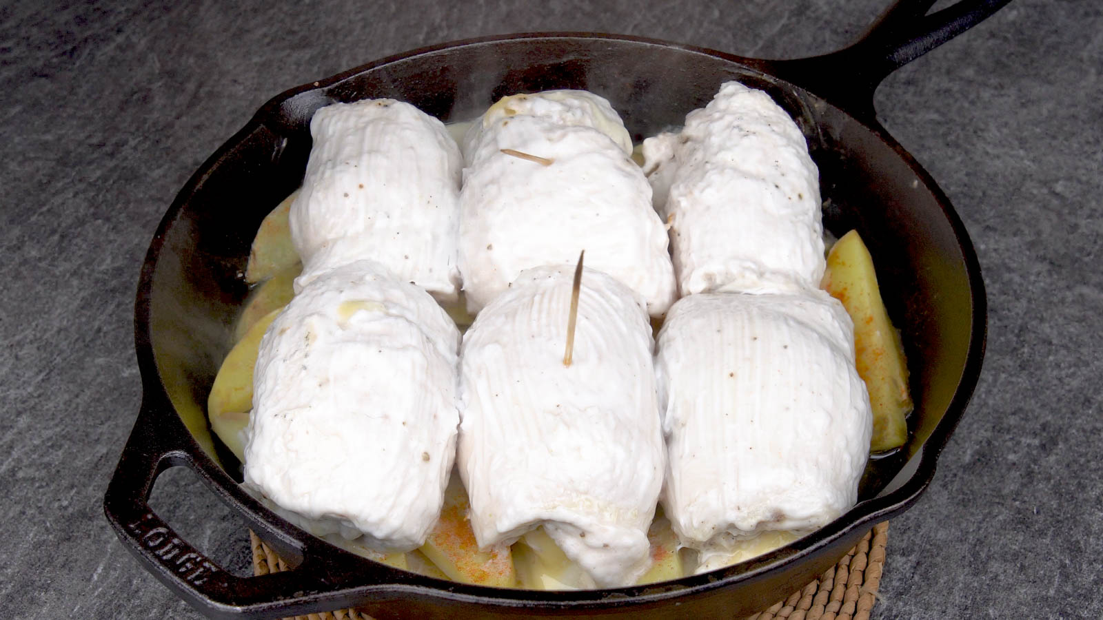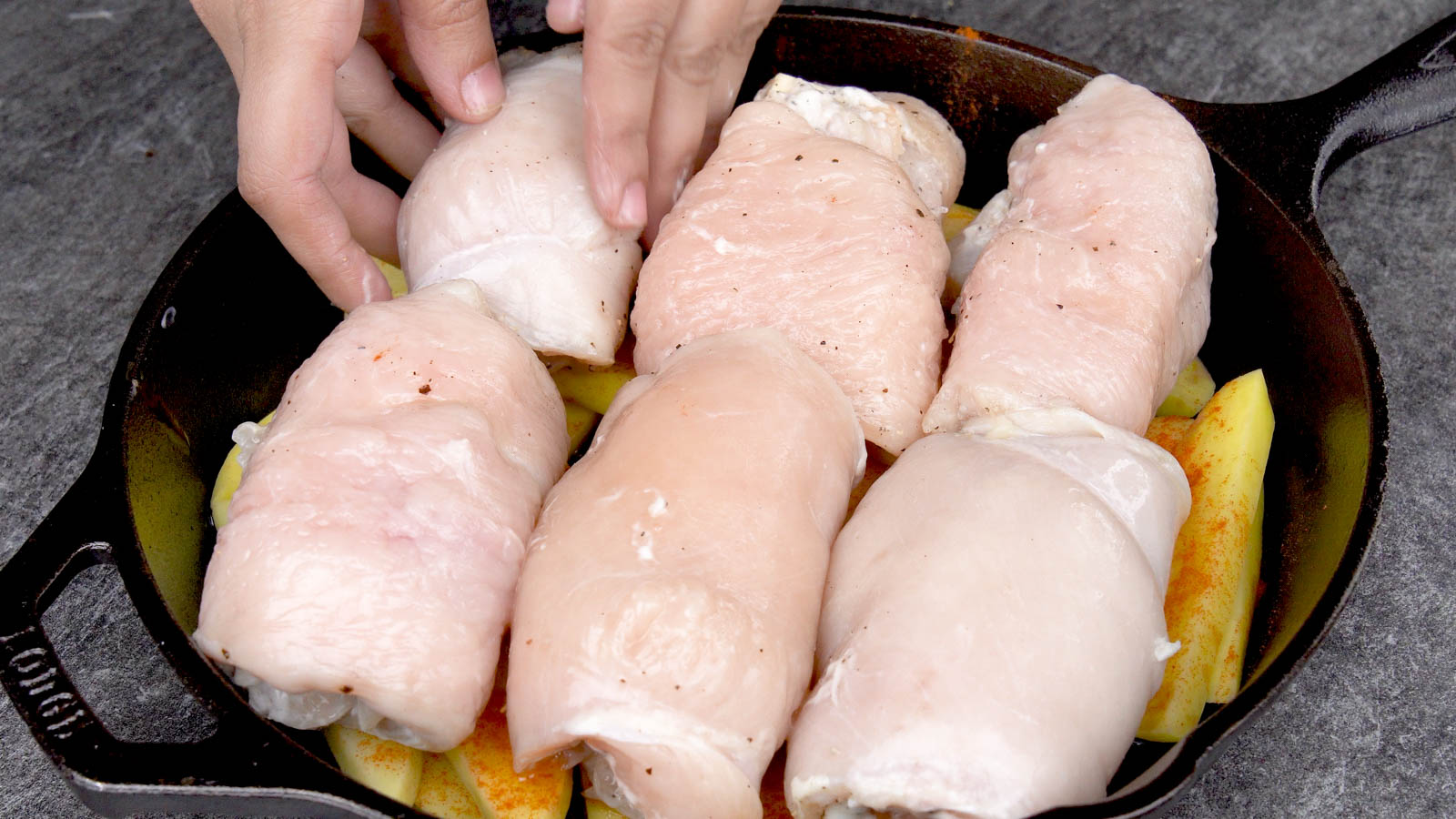 Place the seasoned, mayo-coated chicken fillets directly on top of the potato layer.