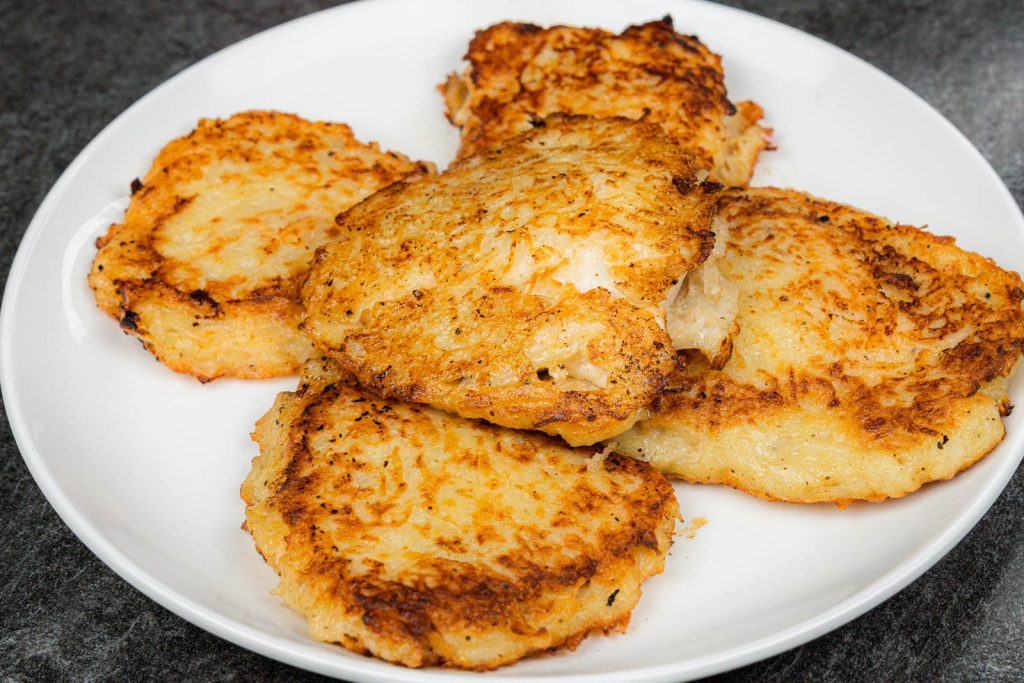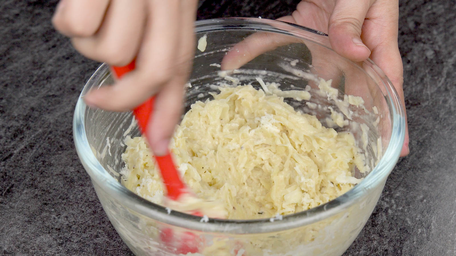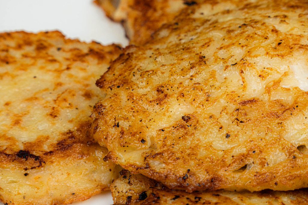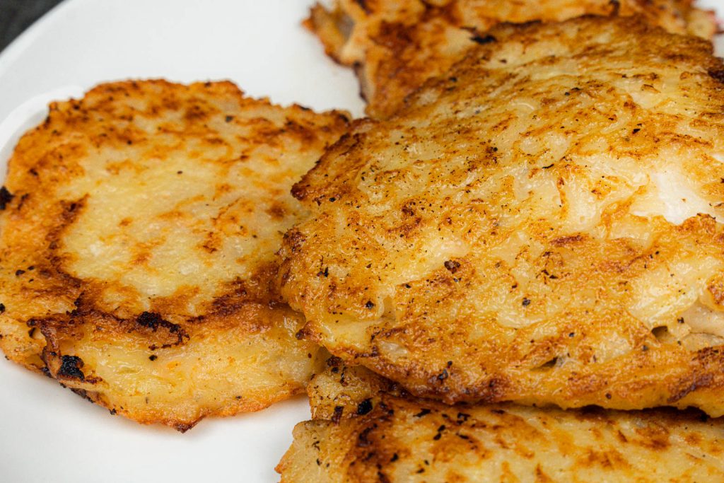 - Peel and grate the potatoes into thin shreds.
