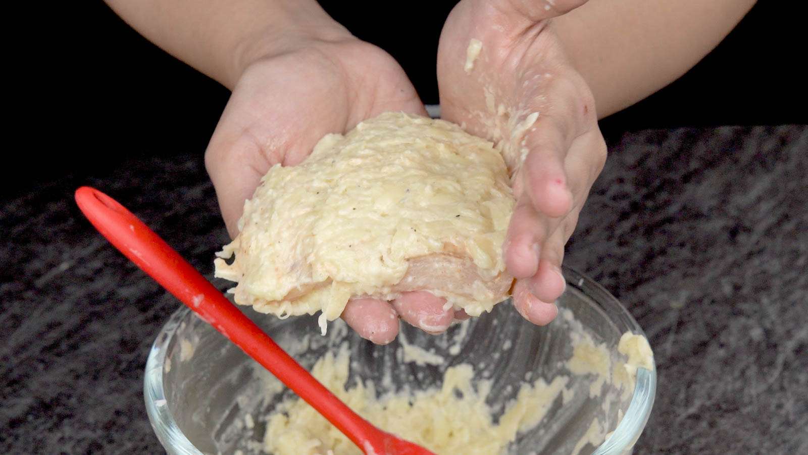- Potatoes: We are grating potatoes to make the crust for the chicken. Also, grate as finely as possible for the potatoes to cook through and stick to the chicken.