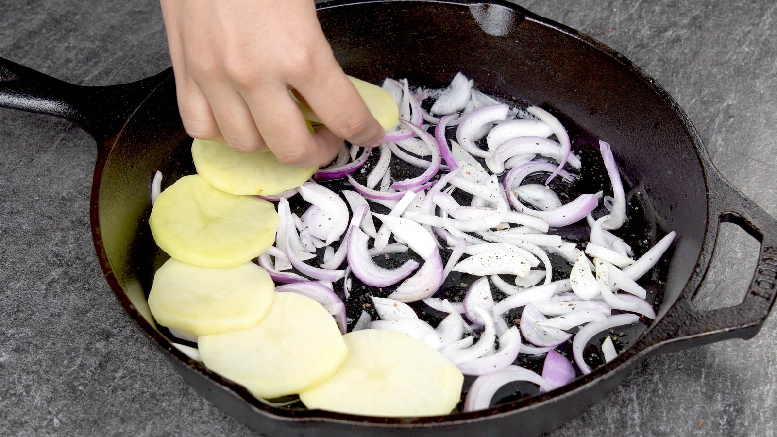 Place your sliced potatoes on top of the sliced onions.
