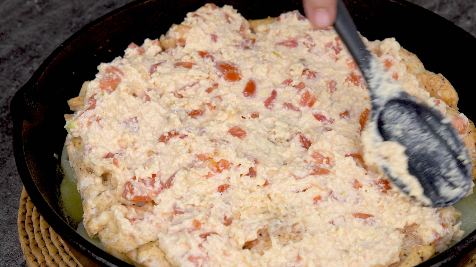 Remove the skillet from the oven and put the mixture on top by spreading it all over the chicken.