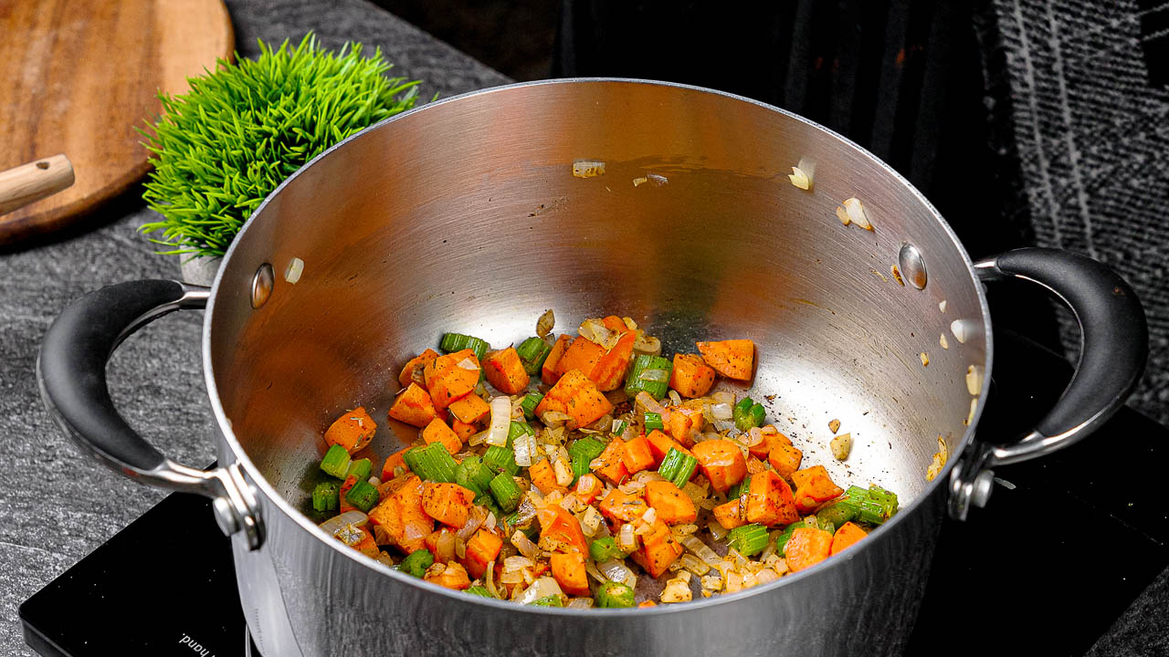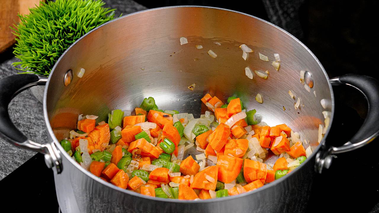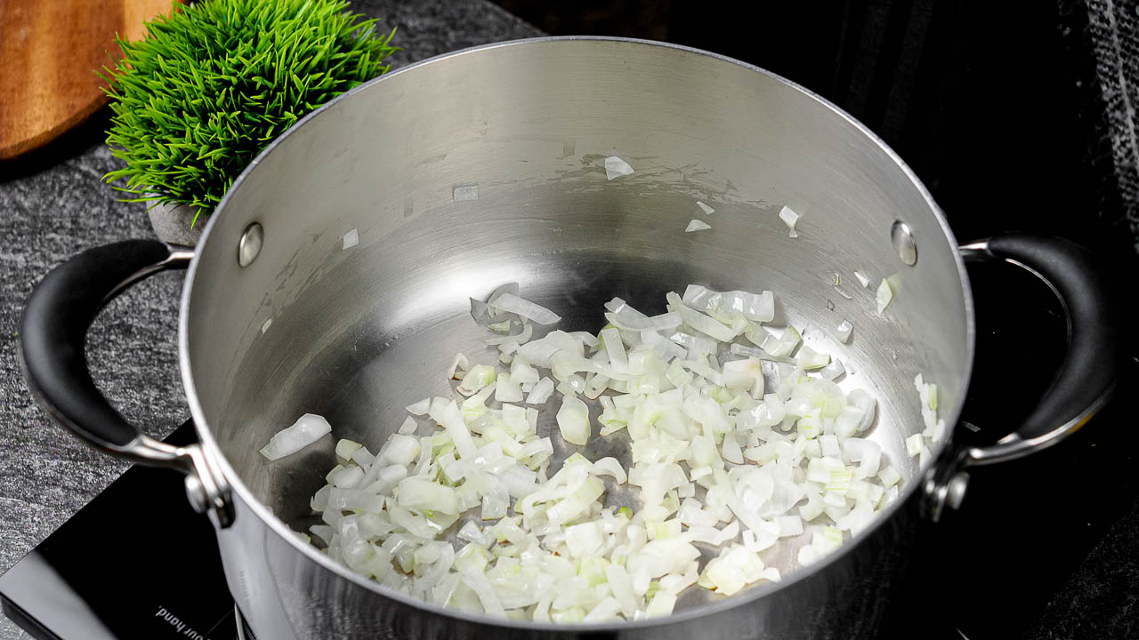 Heat olive oil in a stainless-steel pot over medium heat. Add the diced onion and sauté for about 3 minutes until softened.