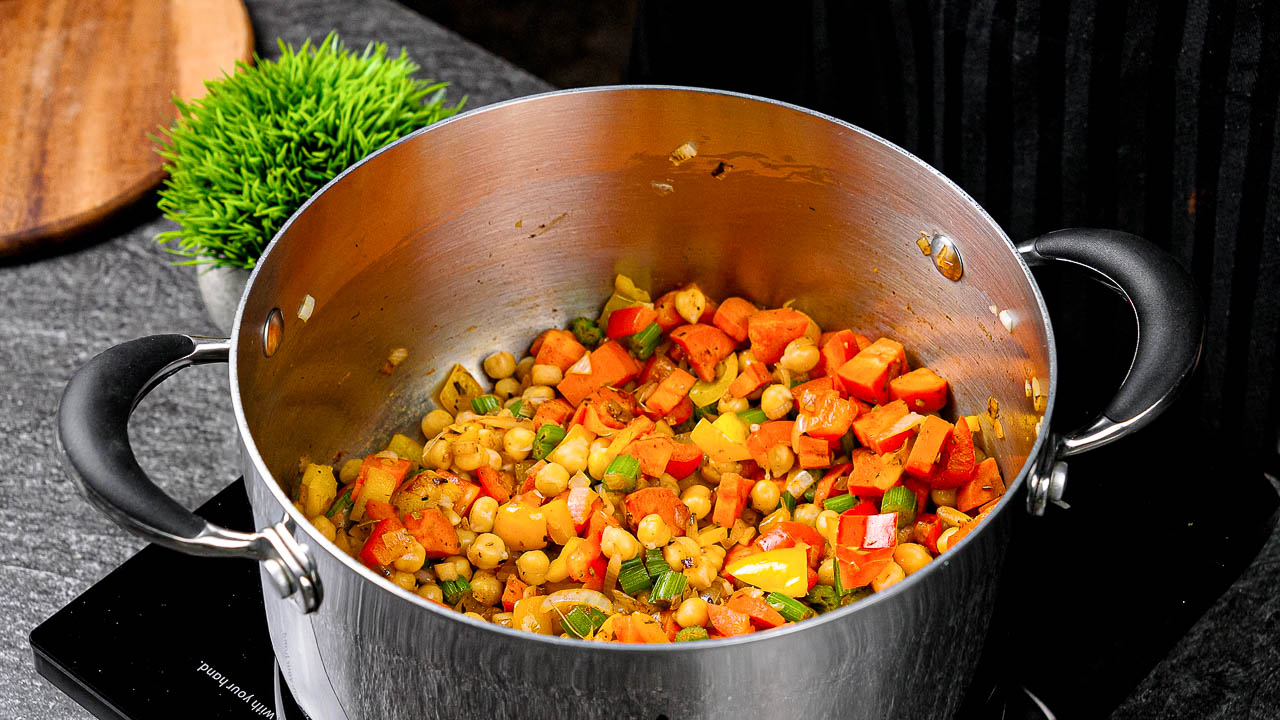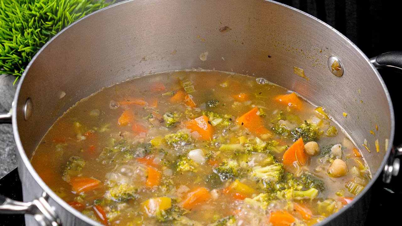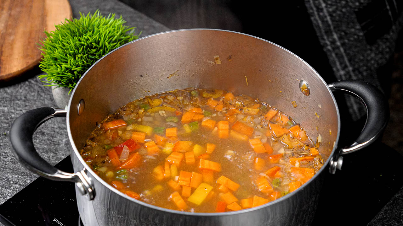 Pour in enough vegetable stock or water to cover the vegetables. Bring to a boil, then cover with a lid.