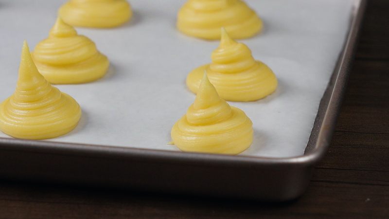 Transfer dough to a piping bag (or use a spoon) and pipe small rounds onto a parchment-lined baking tray.