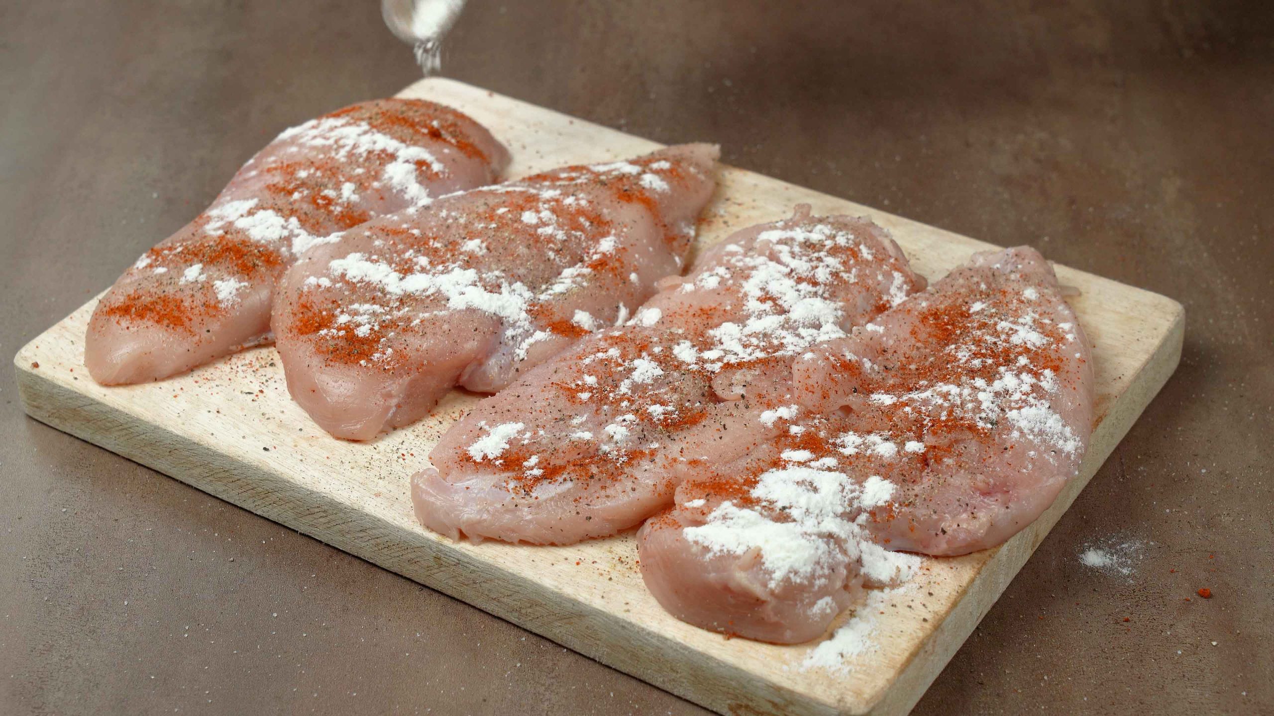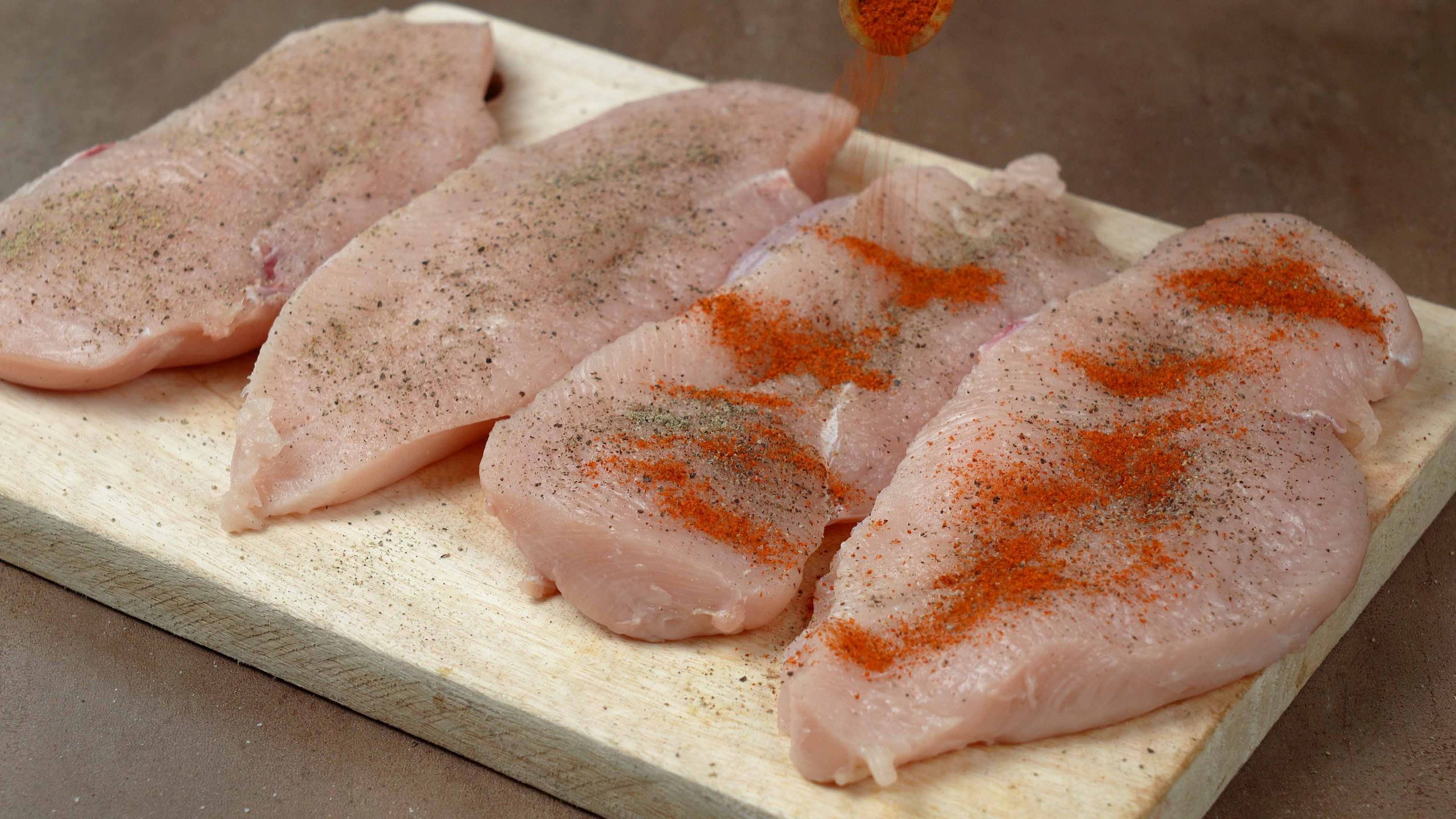 Season the chicken breasts with salt, pepper, and paprika powder.