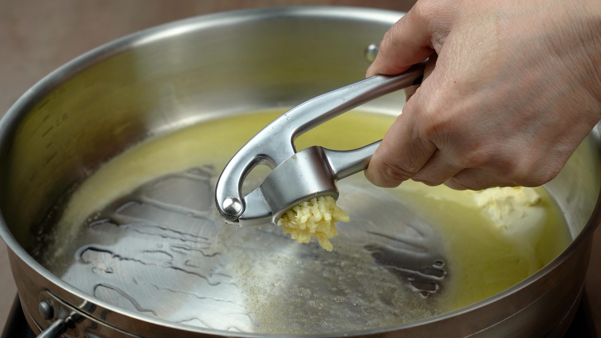 In the same pan, sautรฉ the chopped garlic until fragrant.