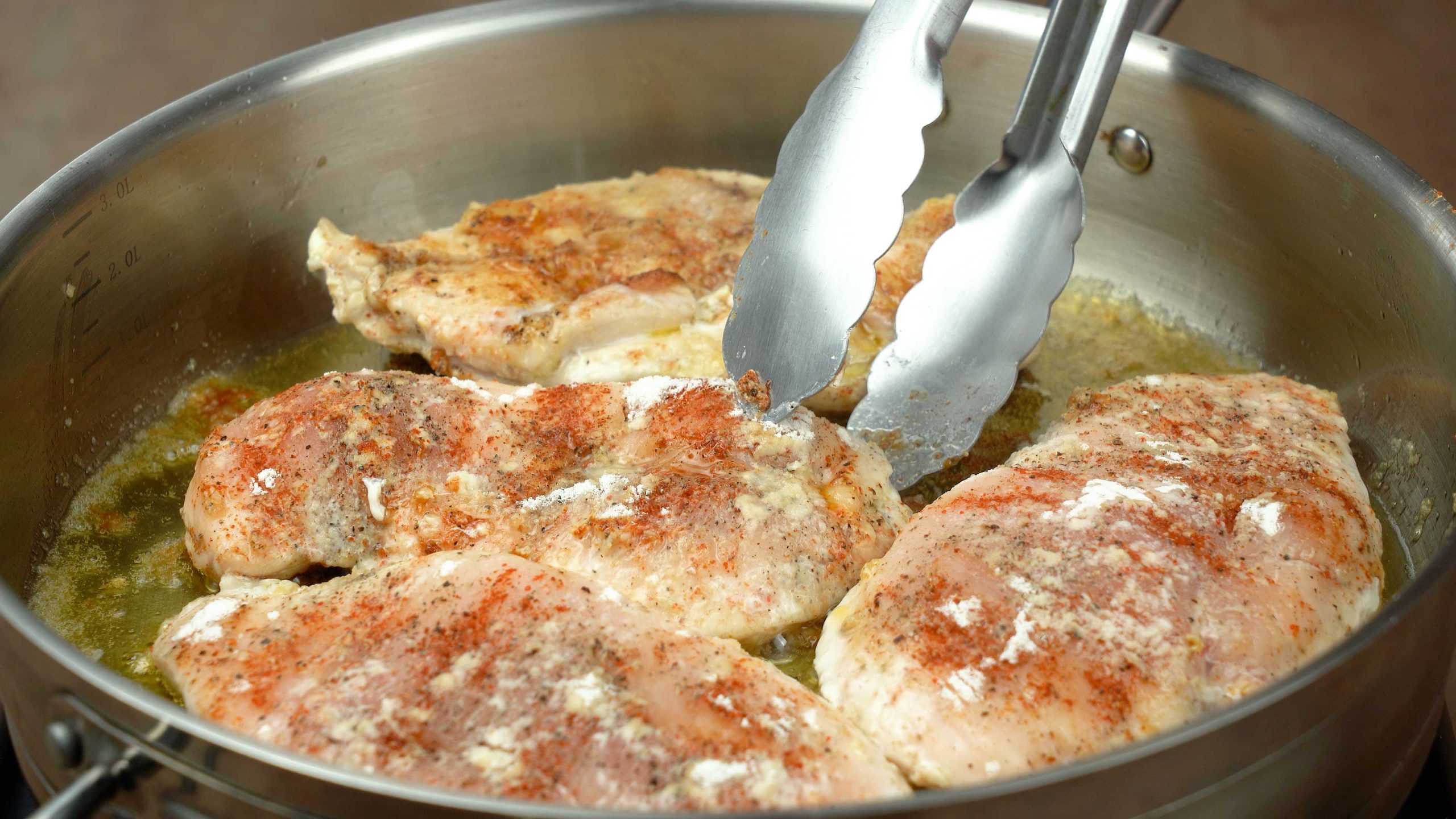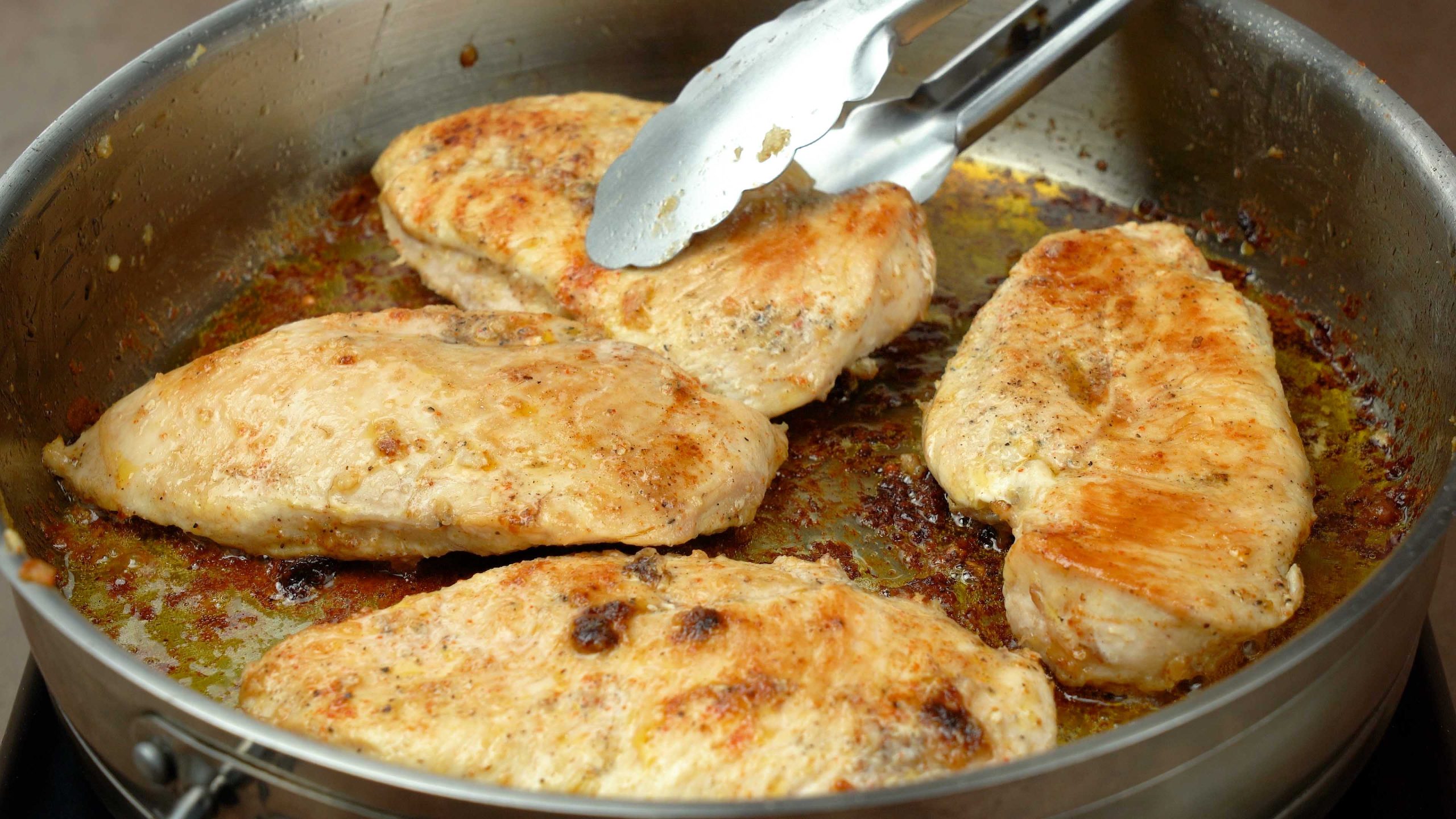 Fry chicken for 4โ5 minutes per side until golden brown.