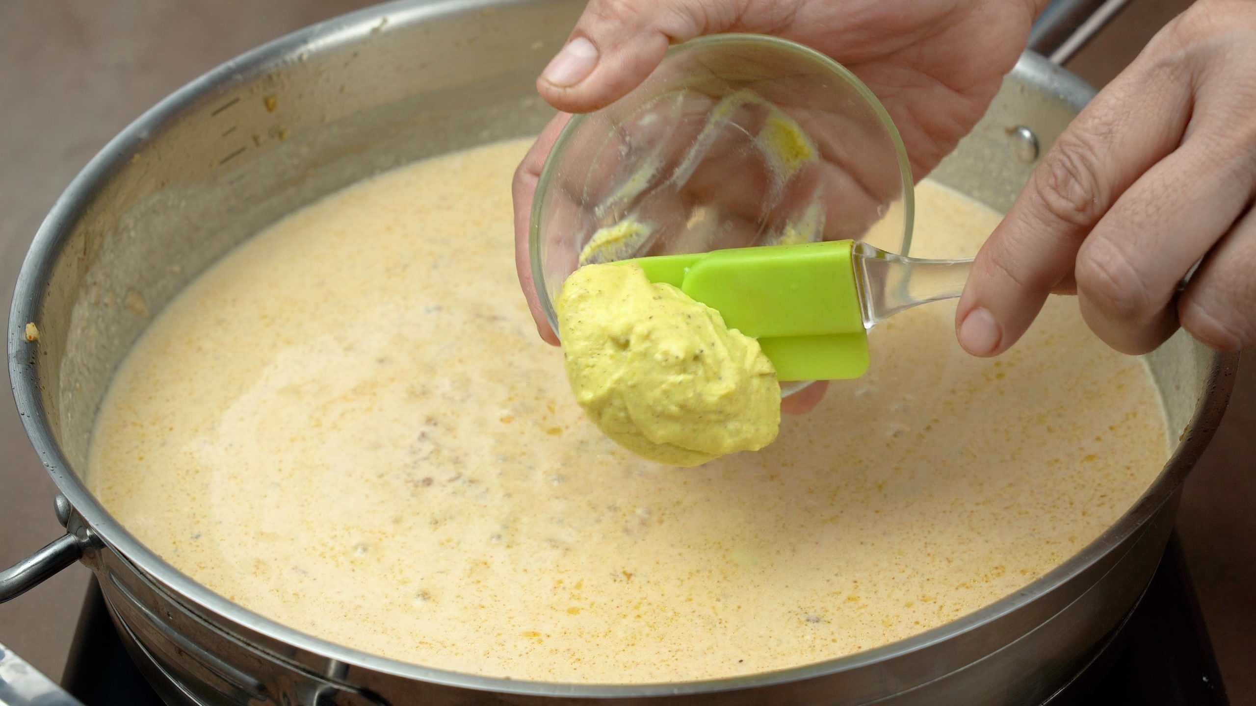 Pour in the cream and Dijon mustard, stirring well.