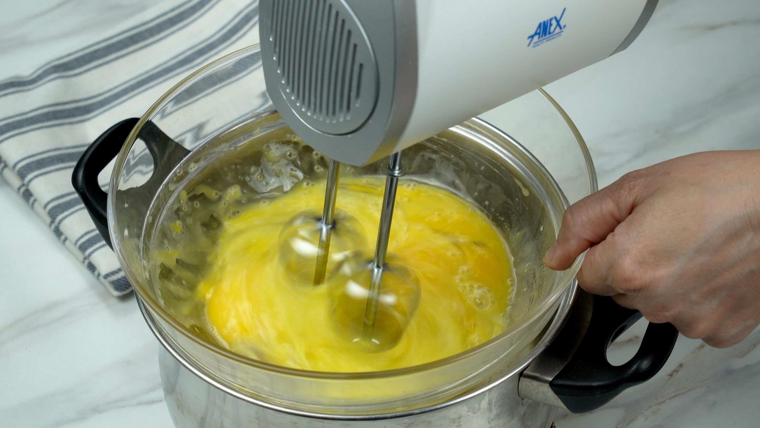 Whisk the egg-sugar mixture (or use an electric mixer) on medium-high speed until the mixture is pale, thick, and ribbons fall from the whisk — about 6–8 minutes.