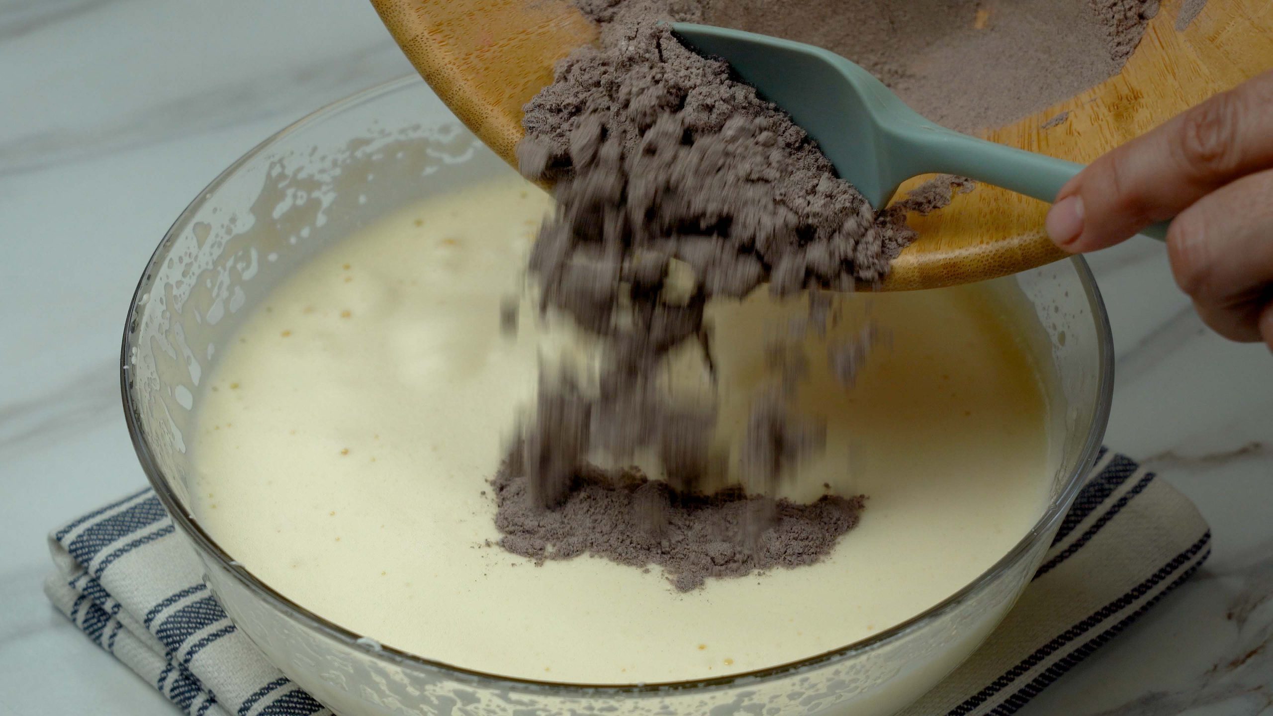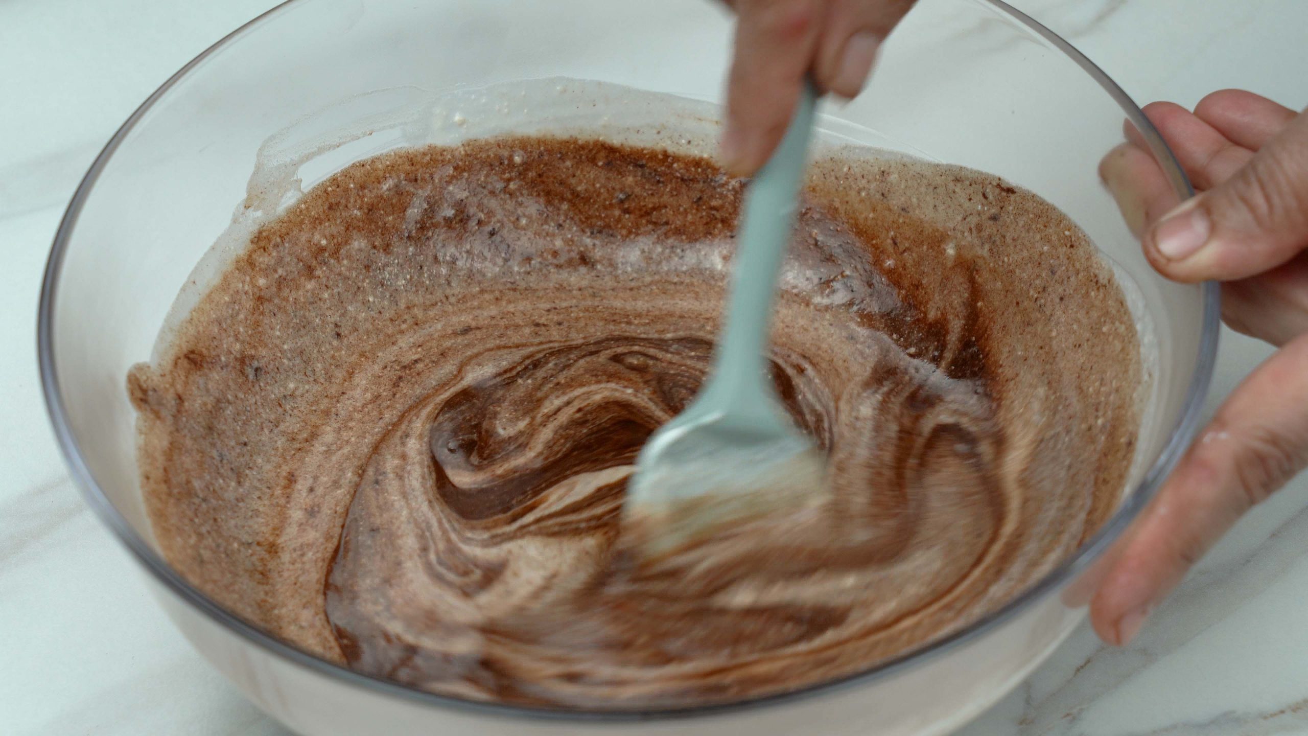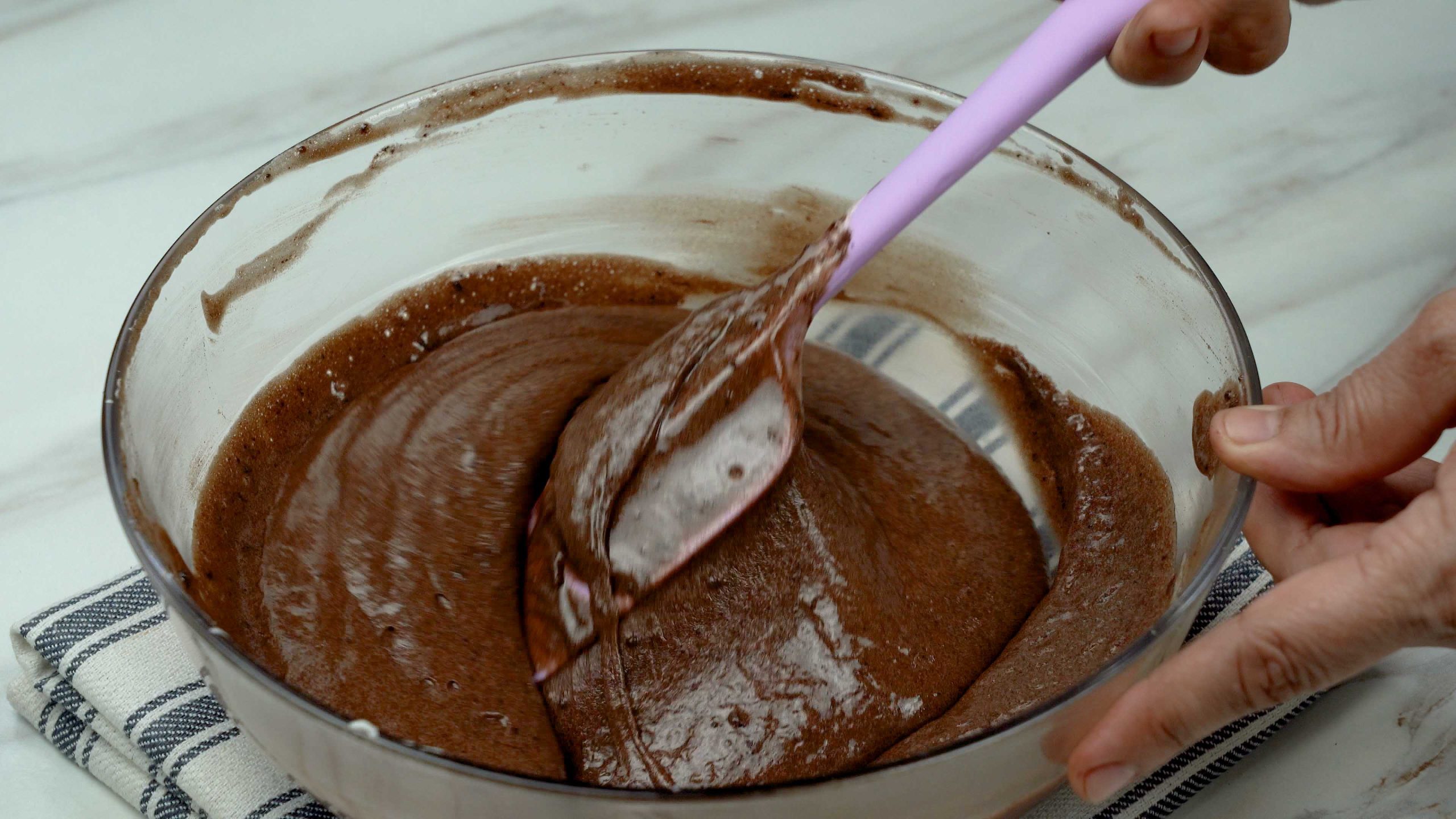 Add the dry mix to the egg mixture in 2 additions, folding gently with a spatula to avoid deflating the batter.