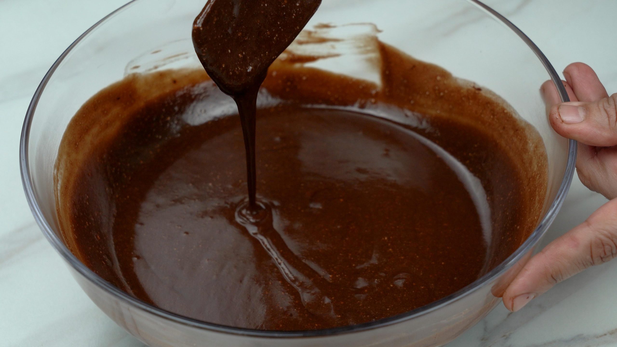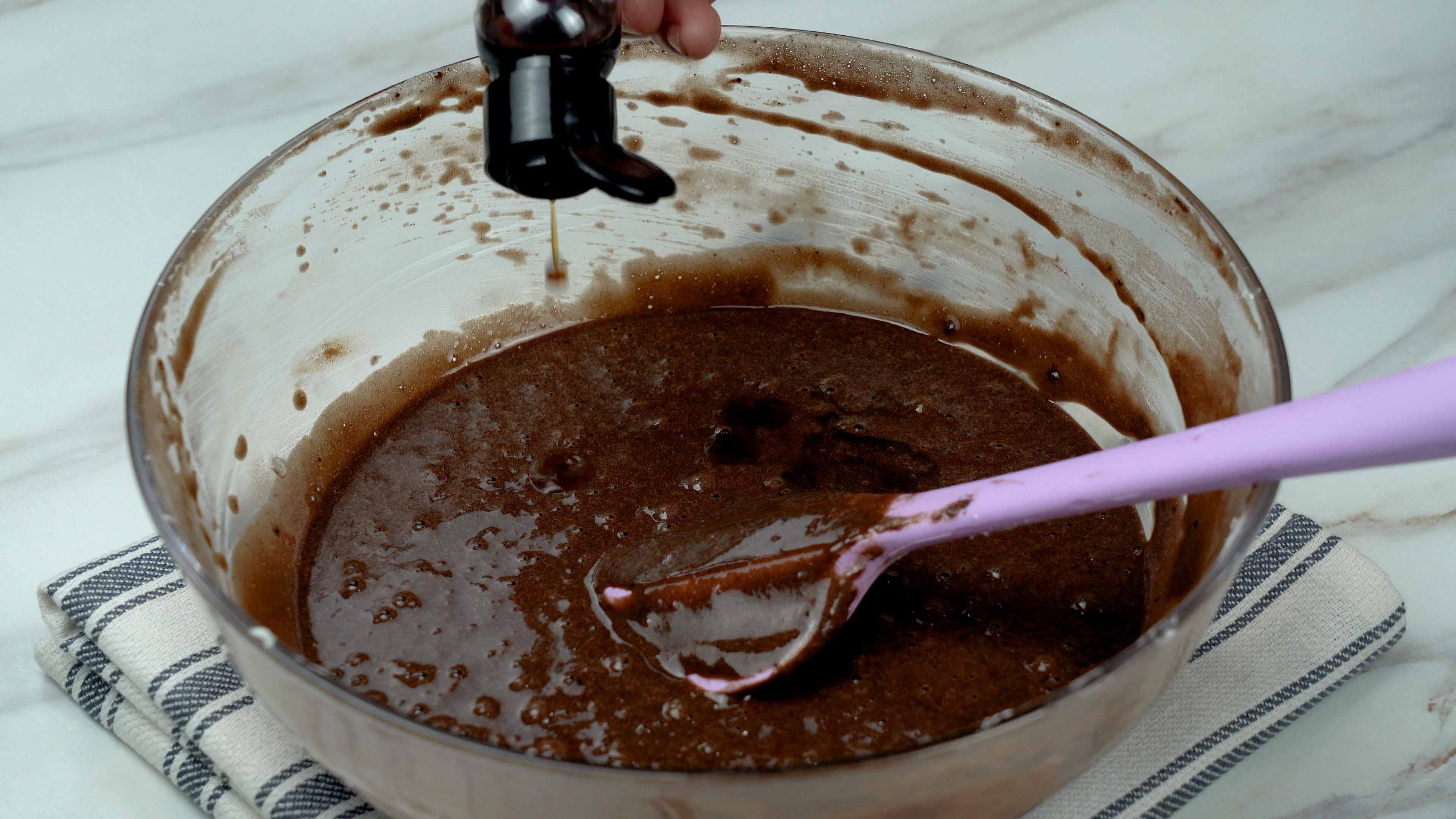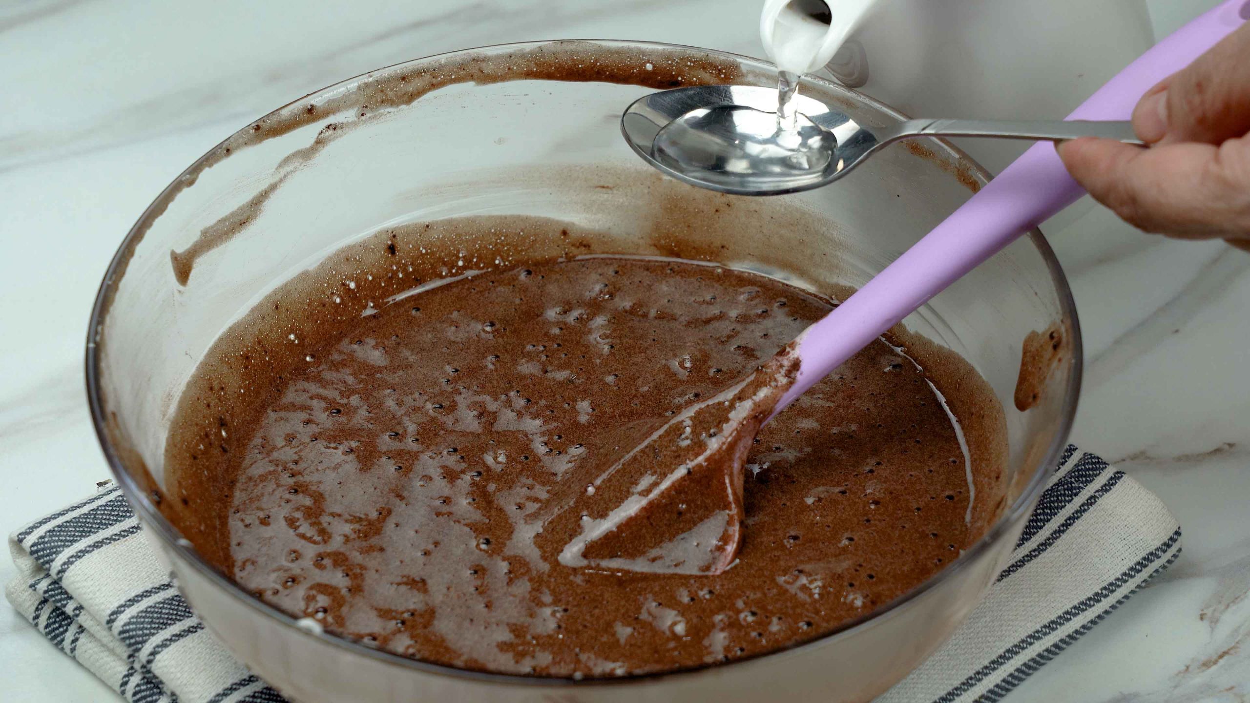 Gently fold in oil, boiling water and vanilla essence. Fold carefully to keep the batter aerated.