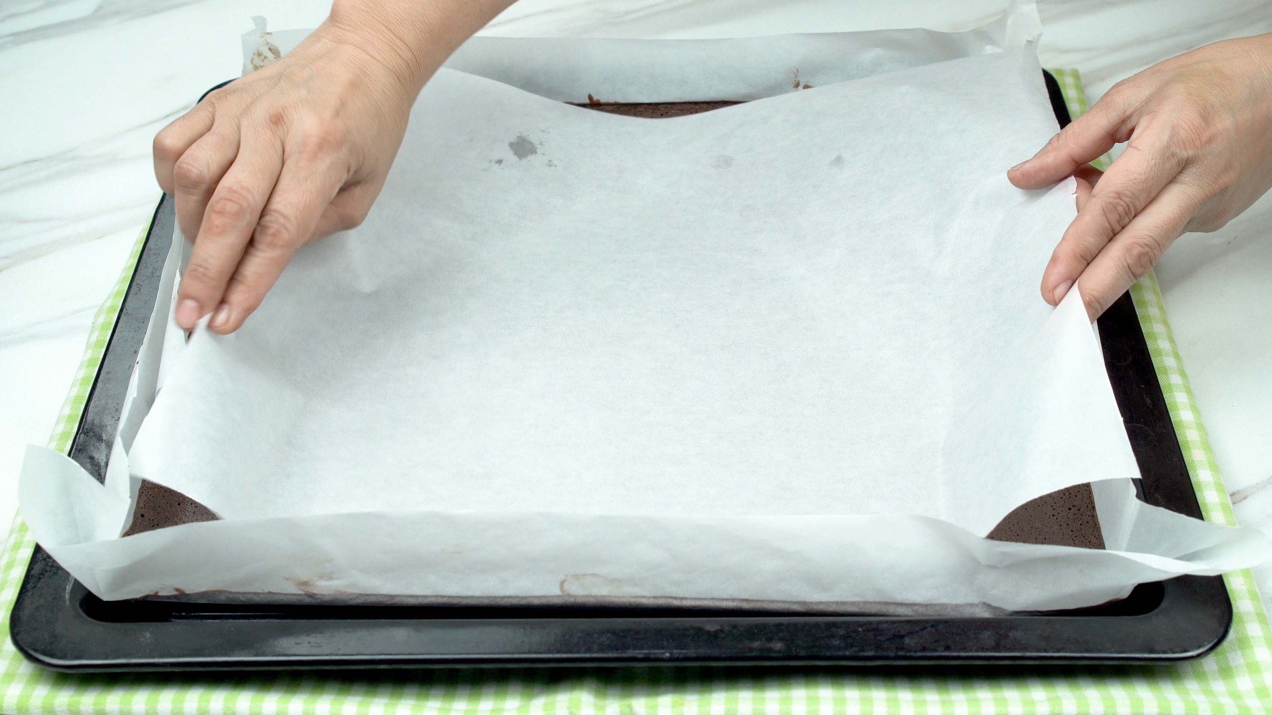 Place a clean kitchen towel or a sheet of parchment on the counter. As soon as the sponge is out of the oven, flip it onto the towel/parchment, peel off the baking paper.