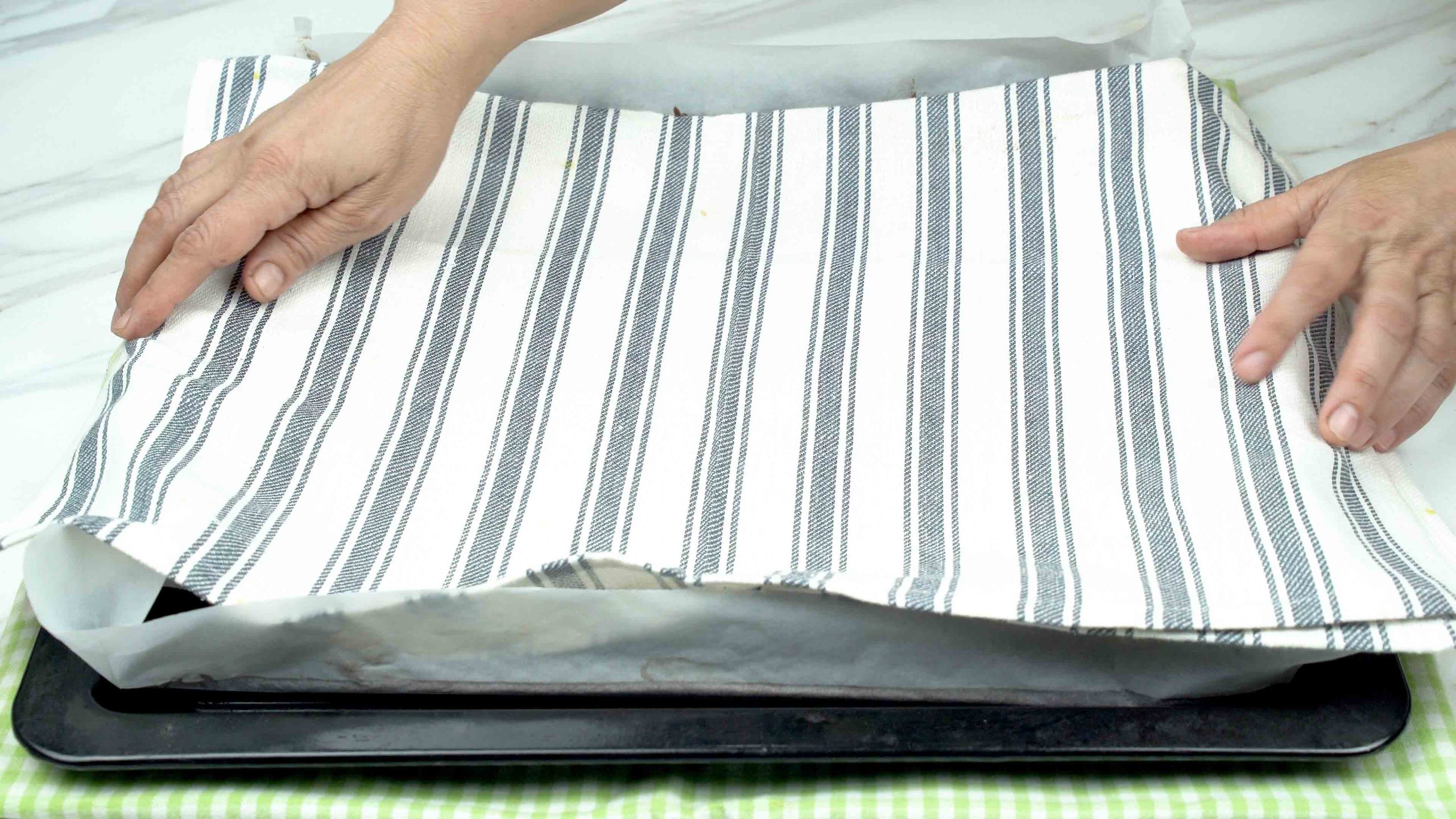 Then roll the sponge with the towel inside (warm). Let it cool completely rolled up — this prevents cracks.