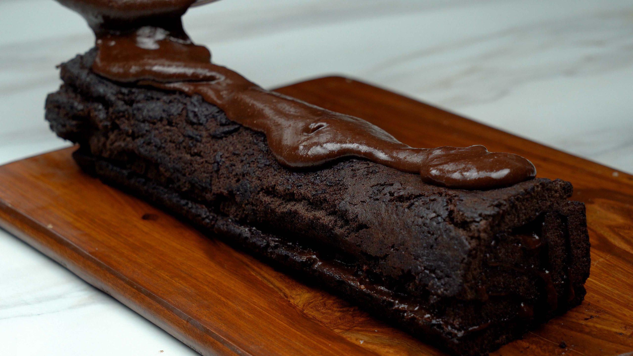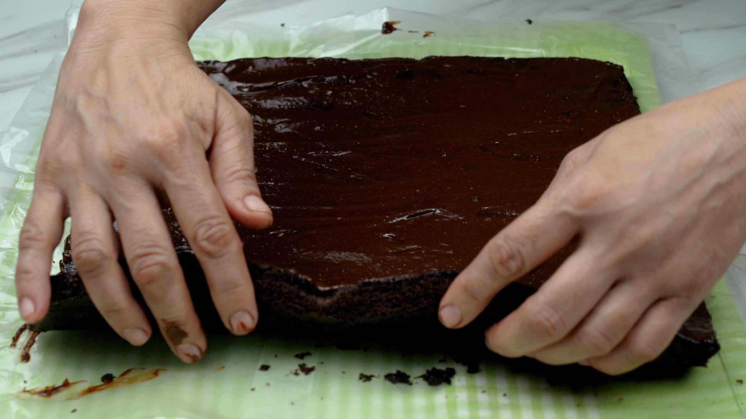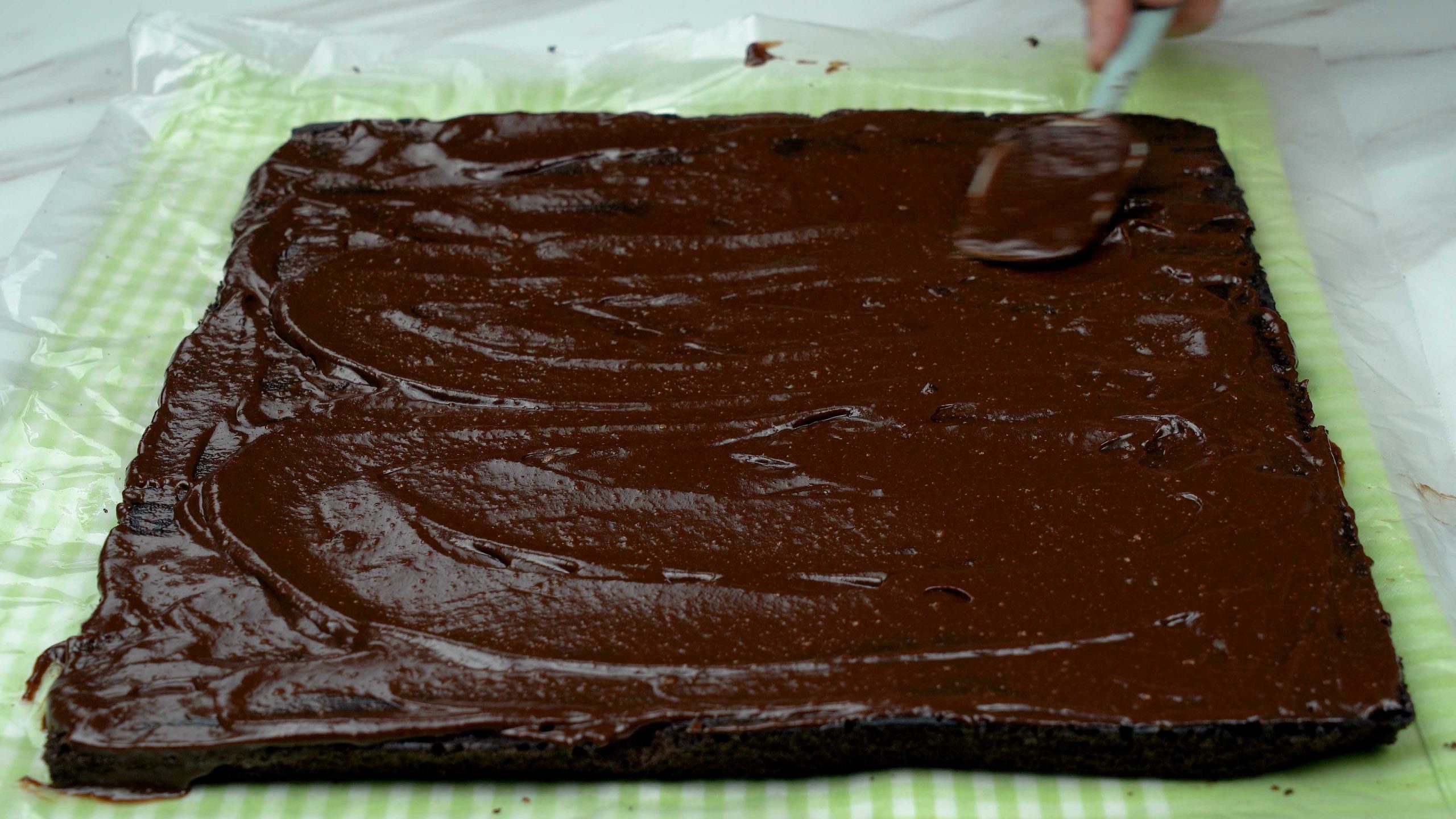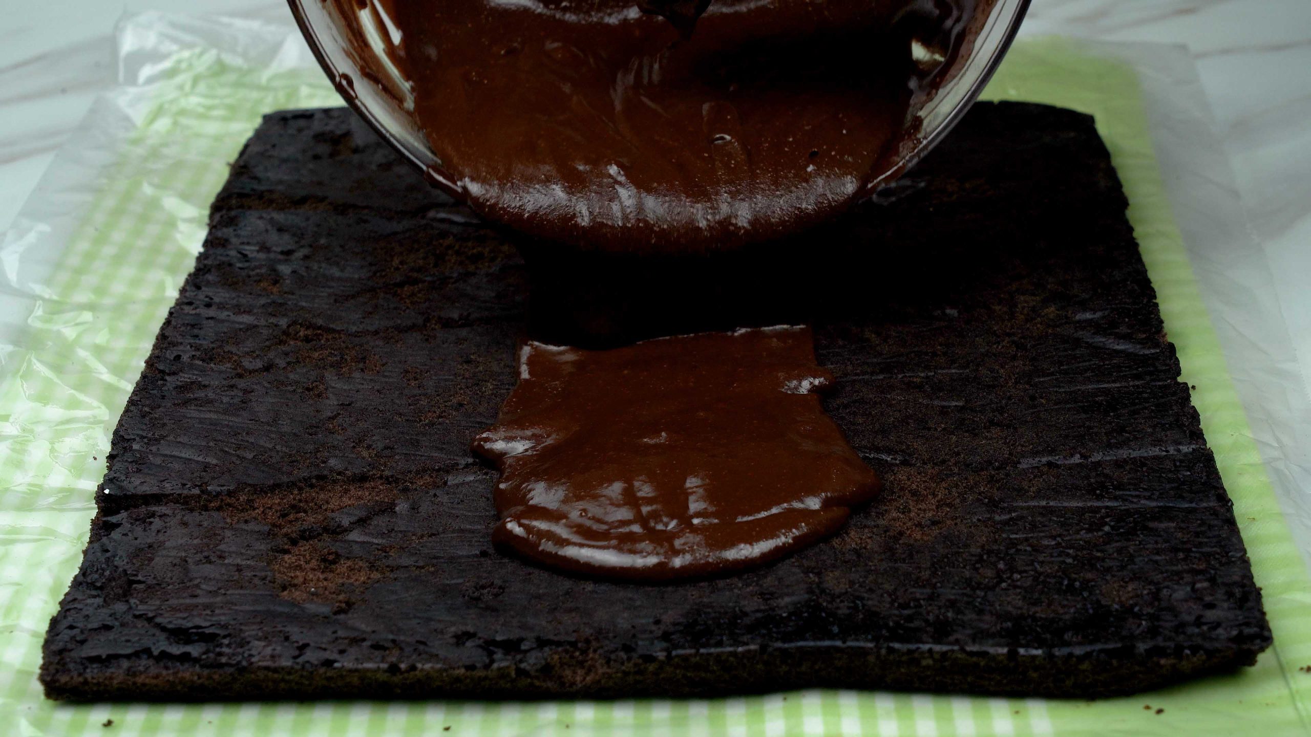 Top the cake roll with the chocolate ganache and spread it out into an even layer.
