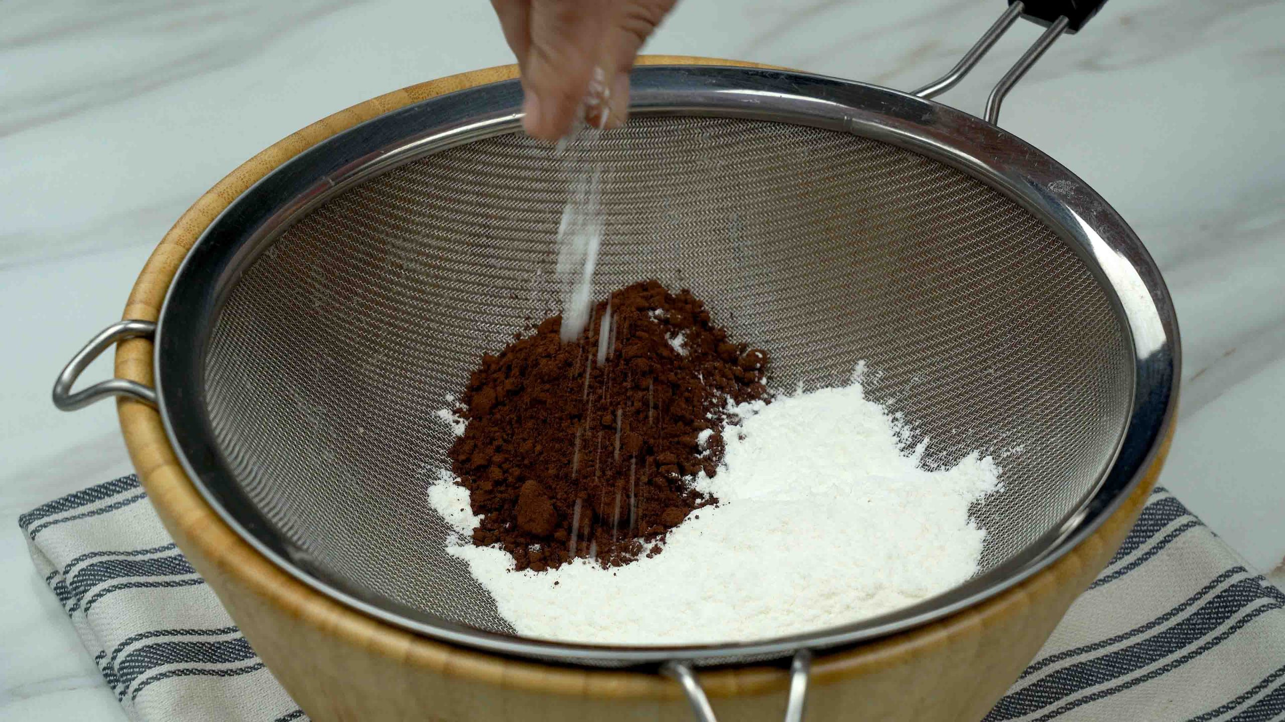 Sift together flour, cocoa powder, baking powder, and salt in a mixing bowl.