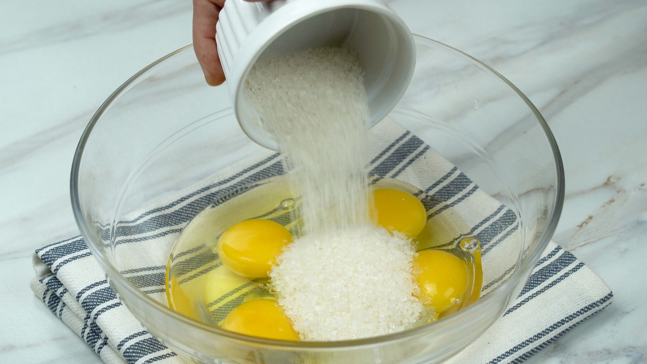 In a large mixing bowl, add 4 large eggs and ½ cup sugar.