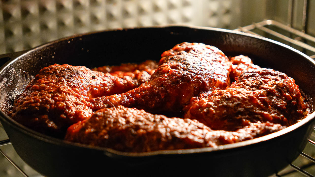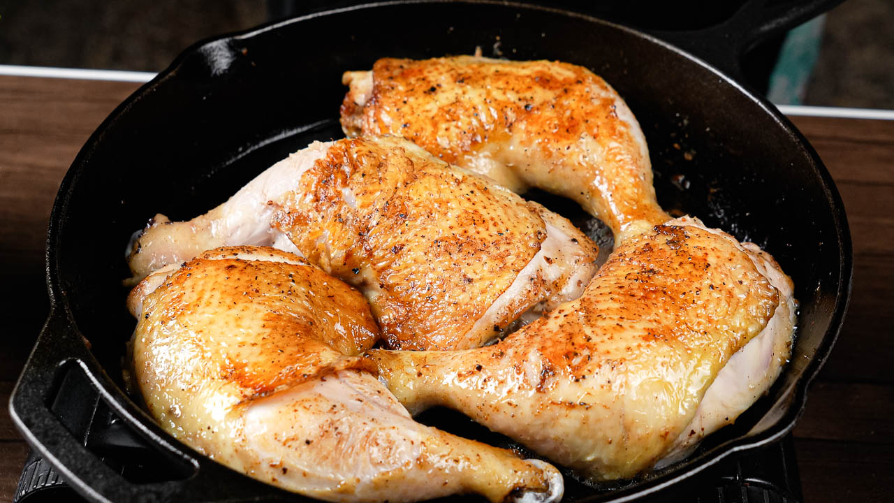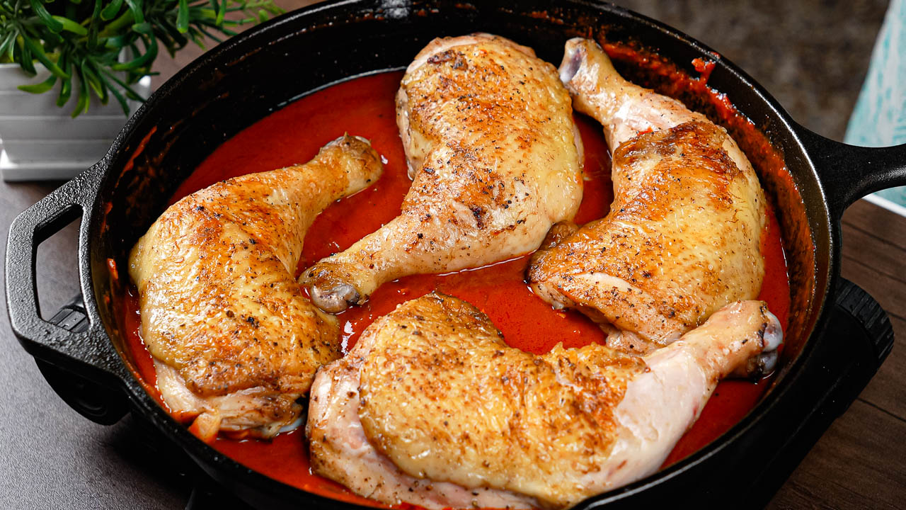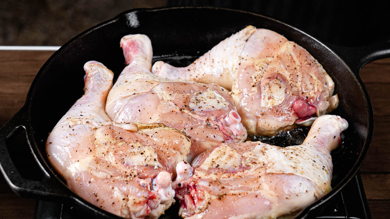 Add the chicken legs, skin side down, and sear until golden brown on both sides (about 5–6 minutes per side).