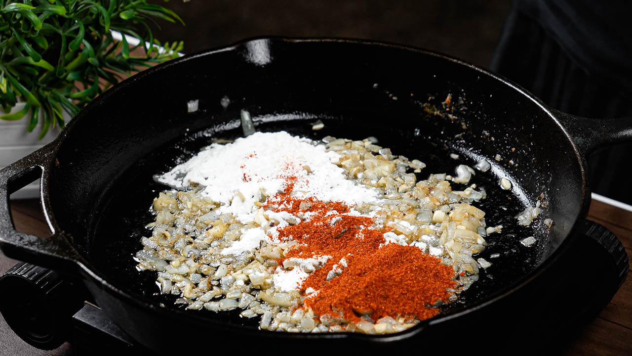 Turn off the heat. Sprinkle in the flour and Hungarian paprika and stir constantly for 30 seconds (to bloom the spice but prevent burning). Stir well to form a thick paste with the onions.