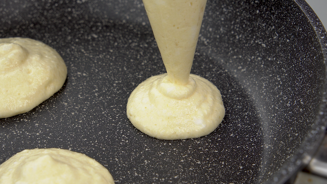 - Transfer the batter to a pastry bag (or zip bag with the corner cut) and pipe tall mounds onto the skillet. If you donโt have a bag, gently spoon mounds. Use ring molds if you want perfectly round, taller pancakes.