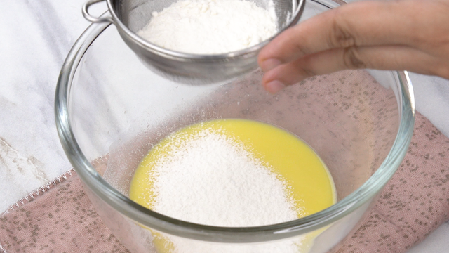 - Sift in 2โ3 tbsp cake flour a little at a time, folding in until you have a smooth, slightly thick batter. Donโt overwork it.