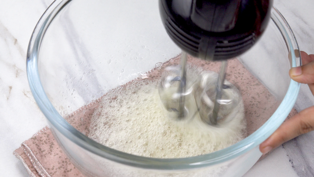 - Start whipping the chilled whites on low speed until foamy.