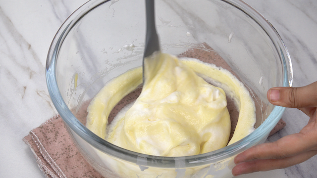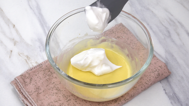 - Pour the lightened yolk mix into the remaining whites, then gently fold with a spatula using a lift-and-turn motion.ย