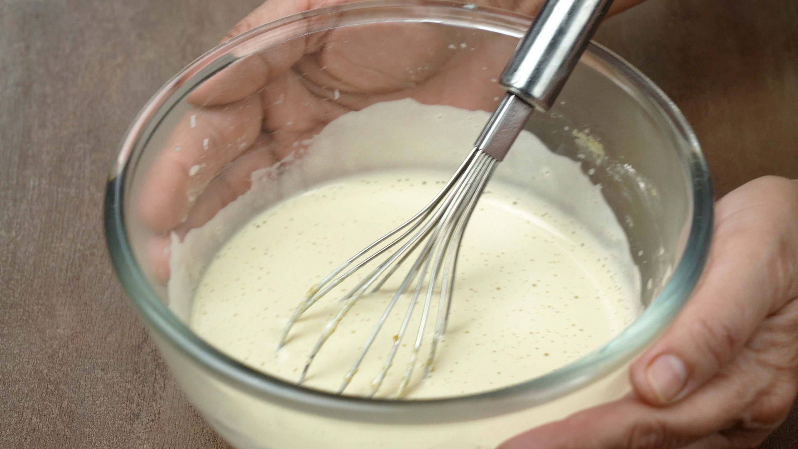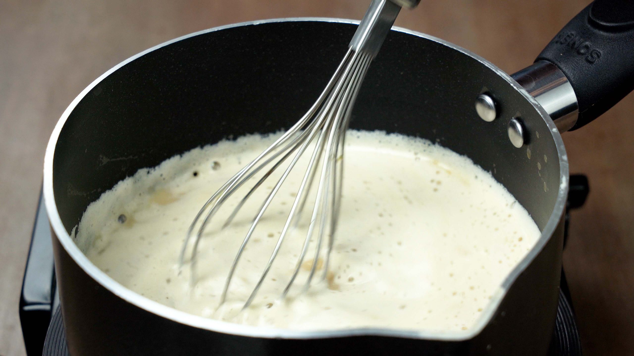 Continuous whisking prevents the eggs from scrambling and keeps the cream smooth.