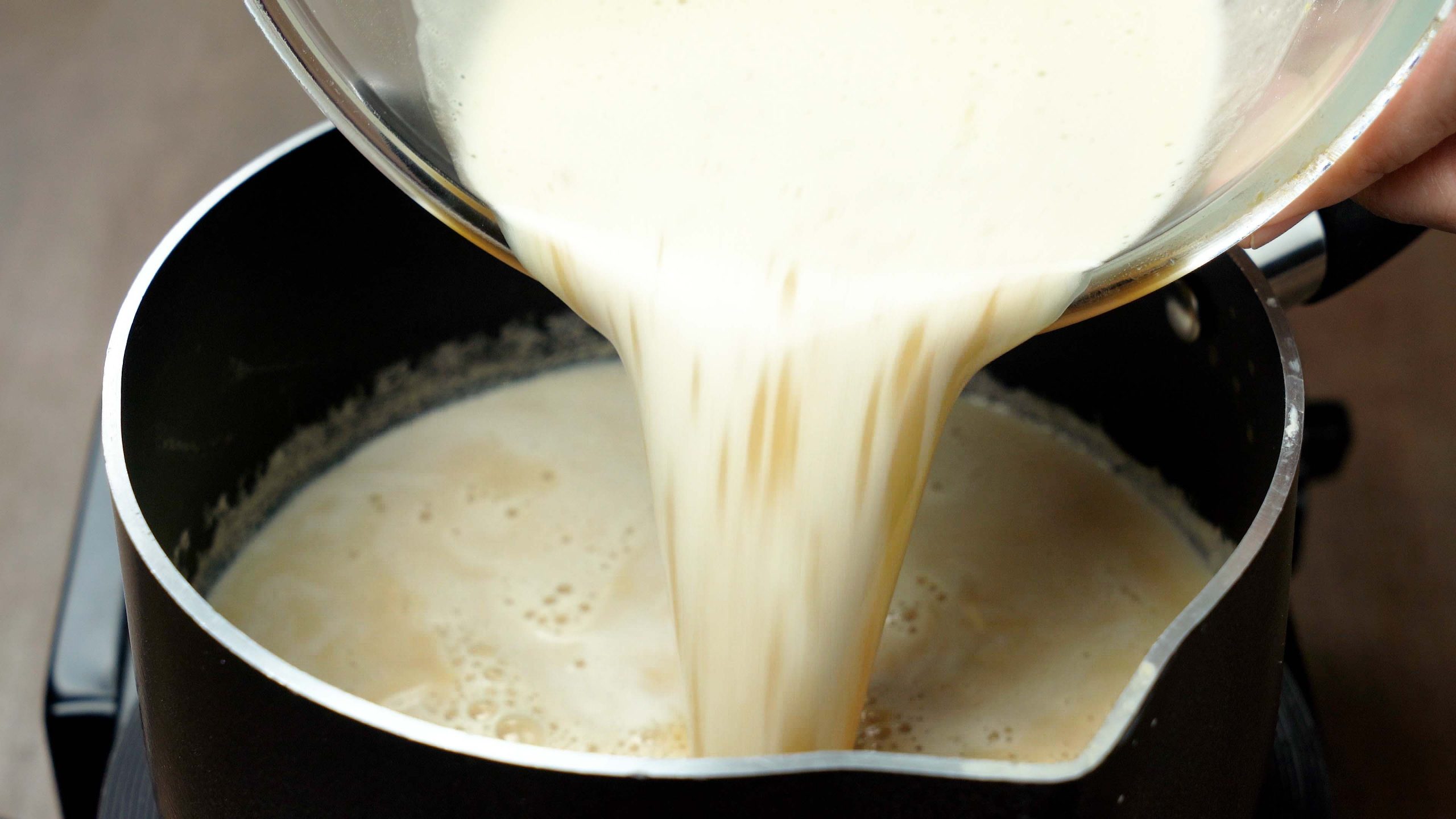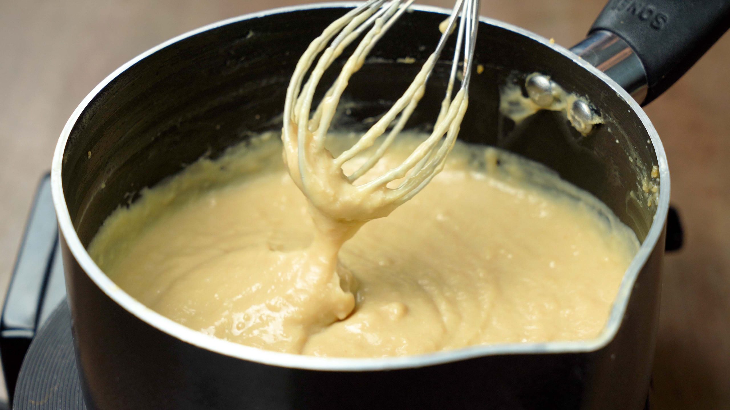 Return the combined mixture to the saucepan and cook over medium heat, whisking very actively until it thickens to a custard consistency.