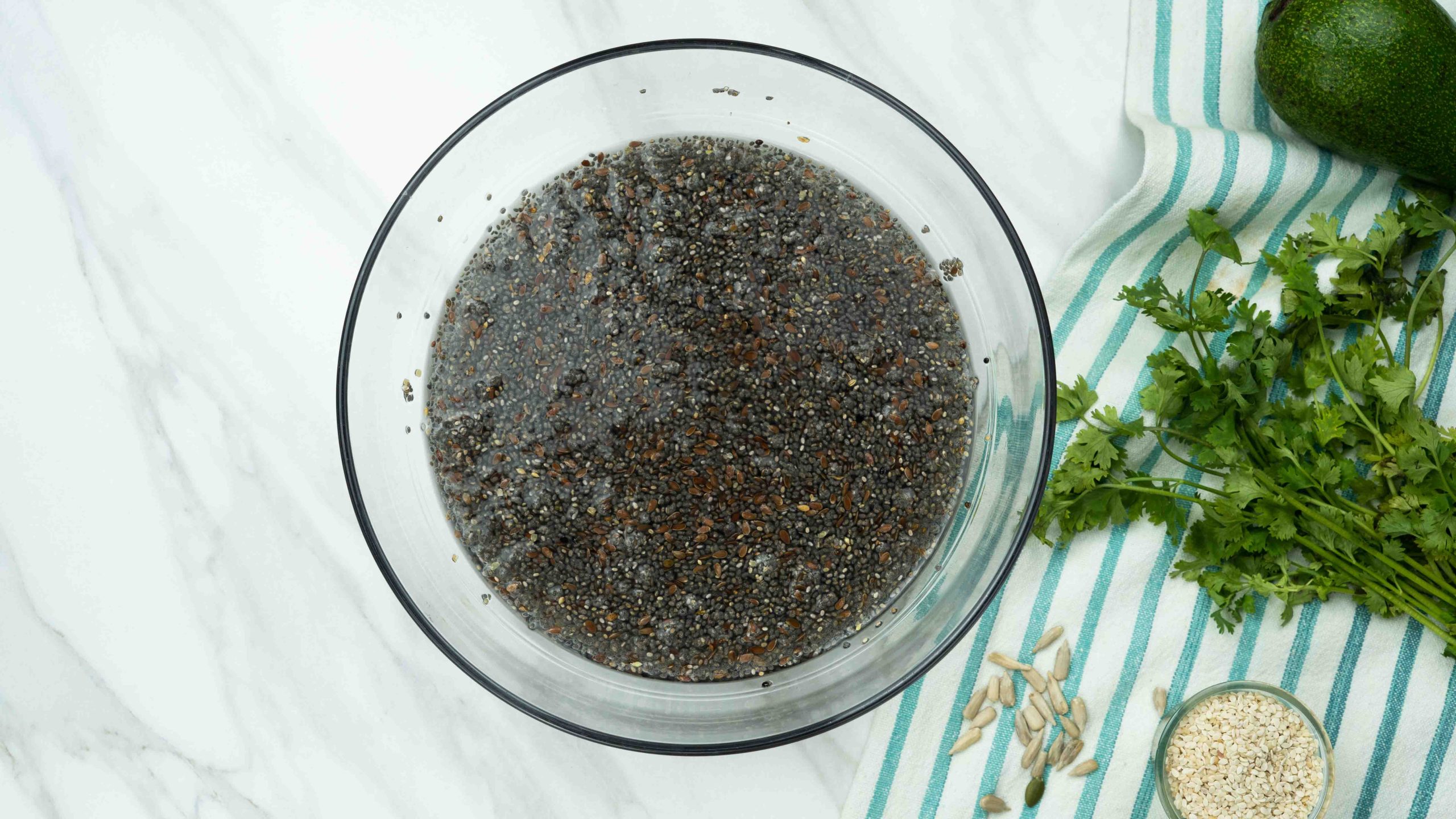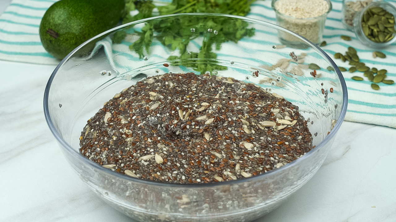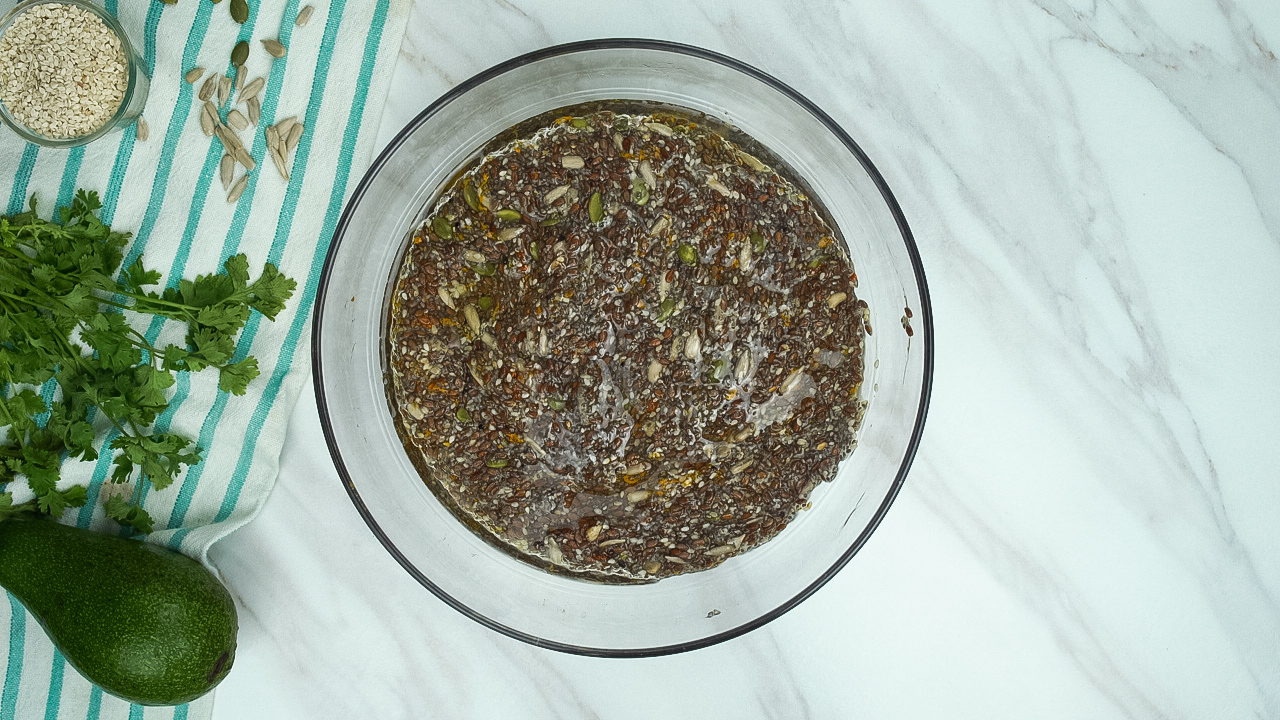 In a large bowl, mix flaxseed, chia, sesame, Add 500 ml water.