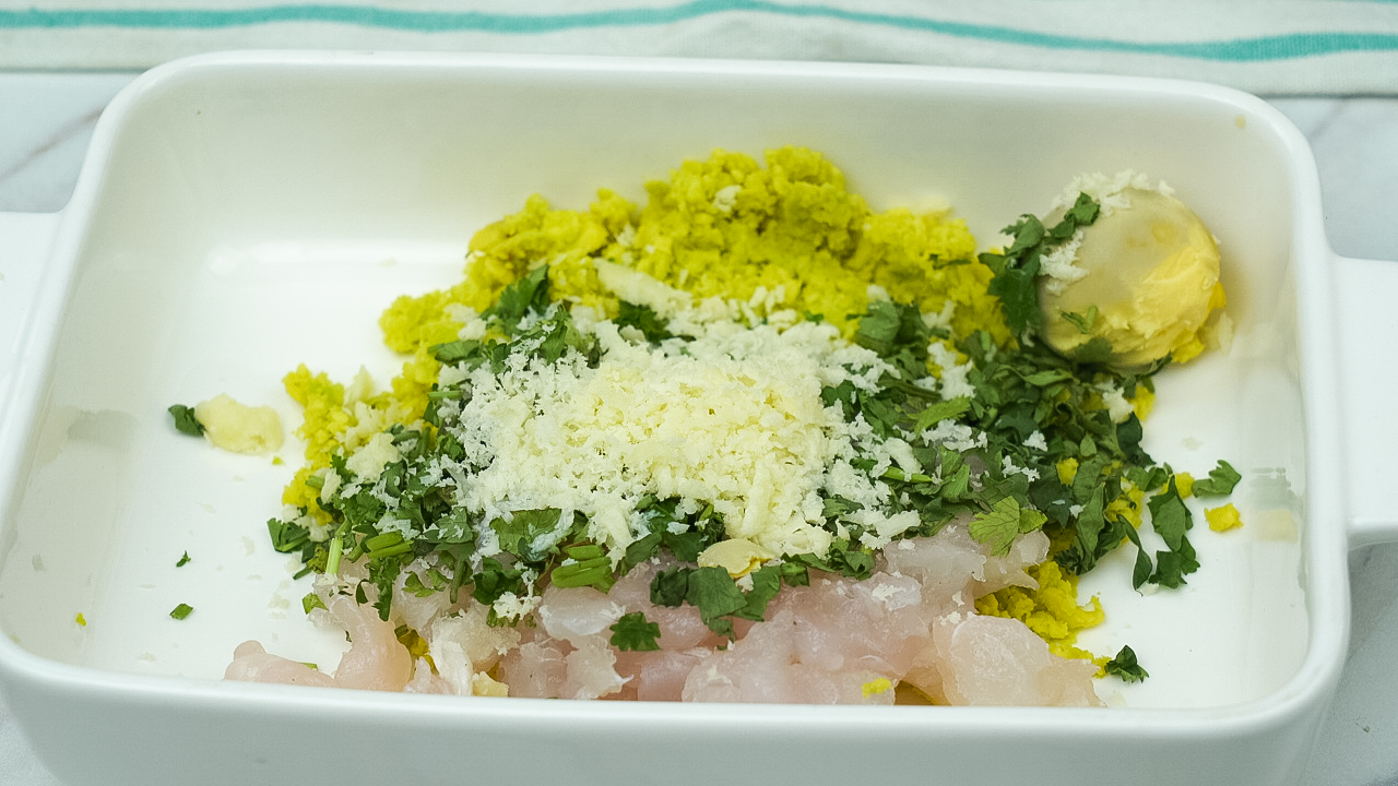 Mash avocado and mix with boiled egg yolk and soft cheese. Add white fish, lemon juice, Parmesan, parsley, and black pepper.