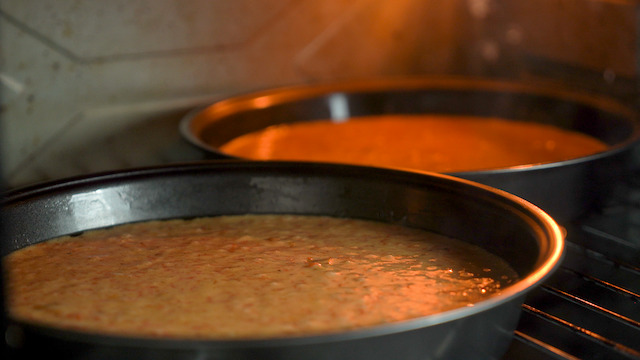 Divide the batter evenly into the prepared pans.