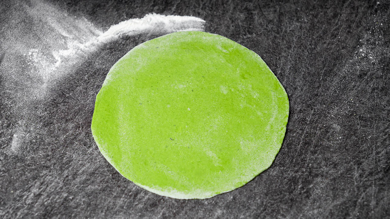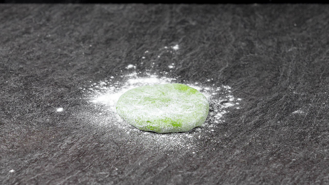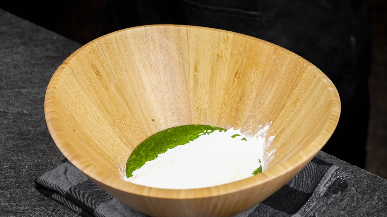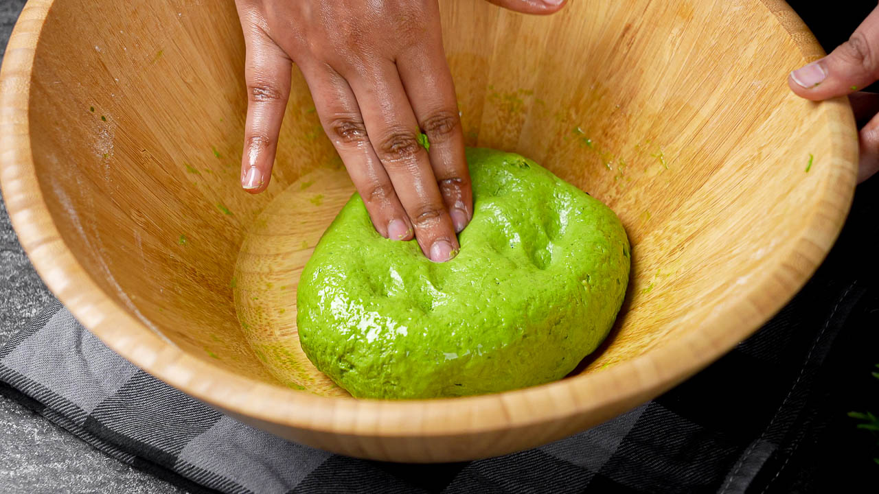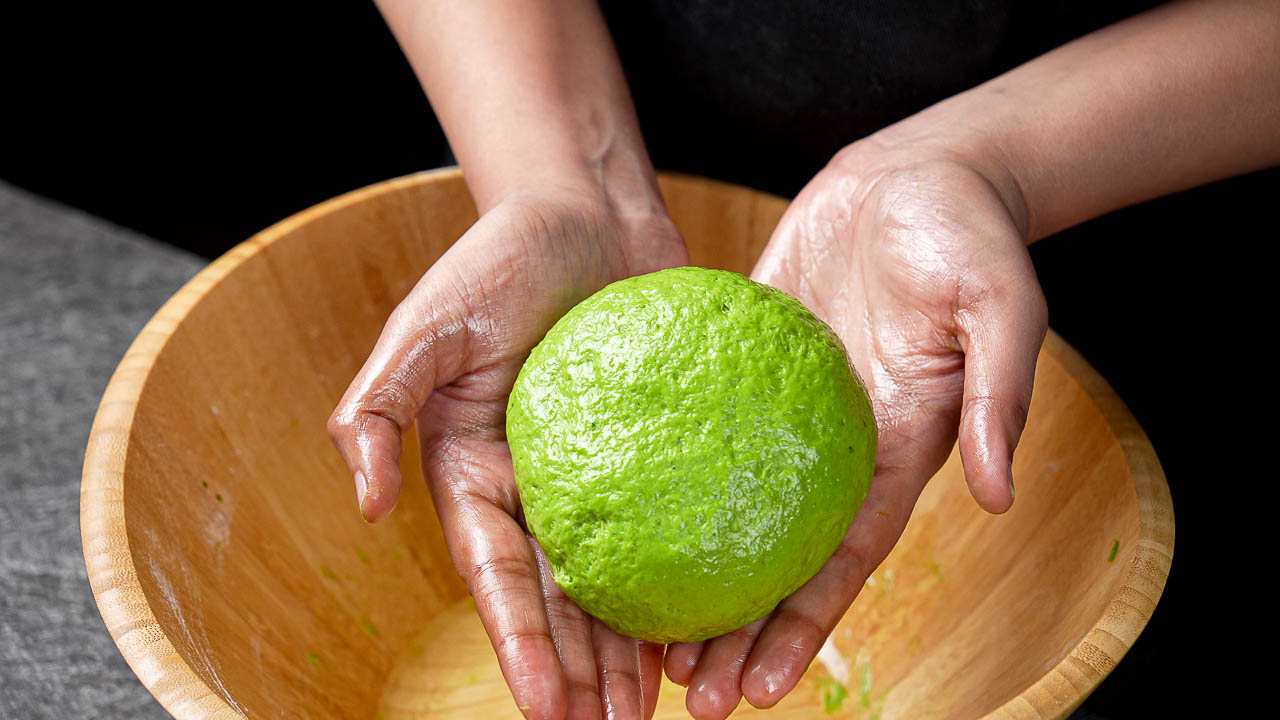 In a large mixing bowl, add the oat flour. Pour in the blended green mixture and mix until a dough begins to form. Knead gently until the dough is about 90% combined and smooth.
