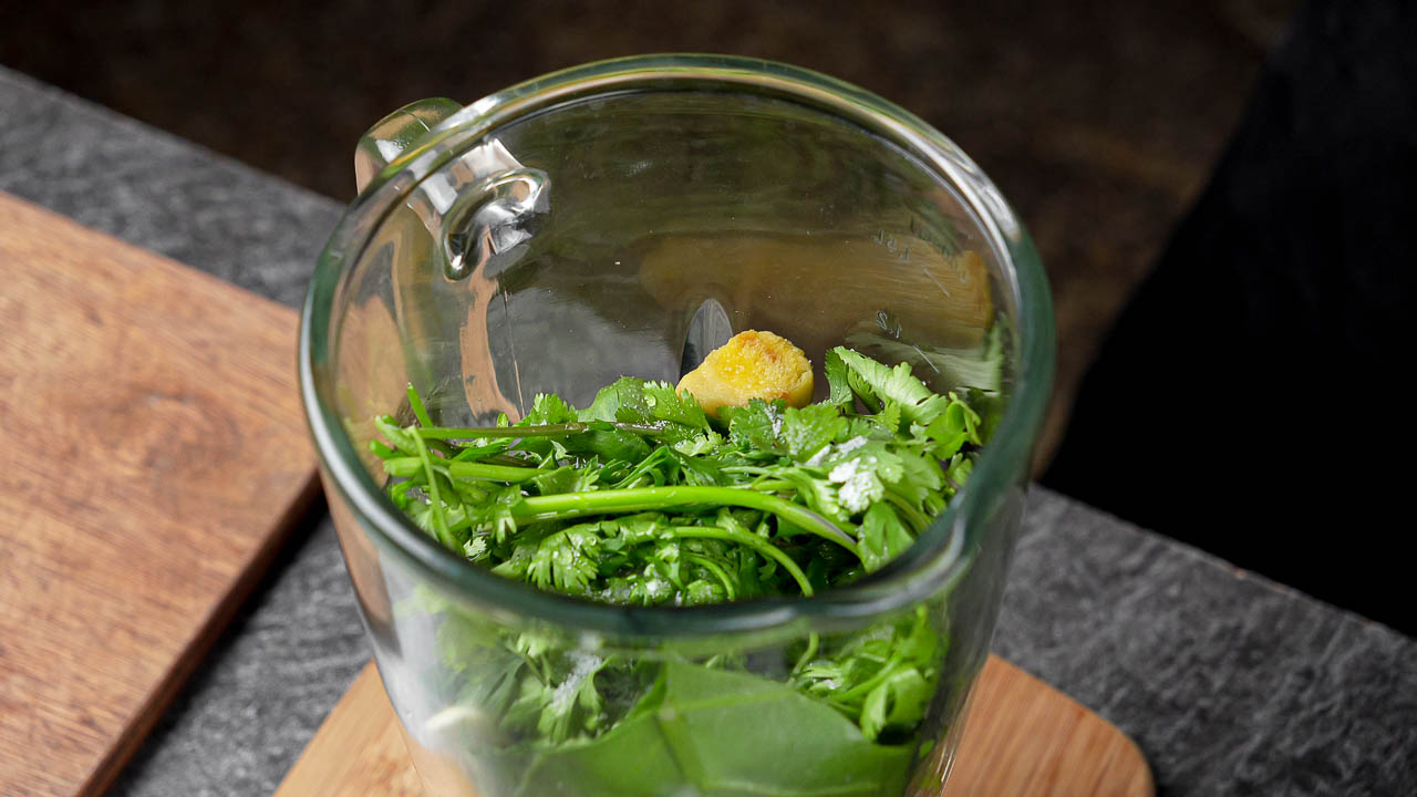 In a blender, combine spinach, cilantro, ginger, garlic, water, and salt. Blend until smooth.