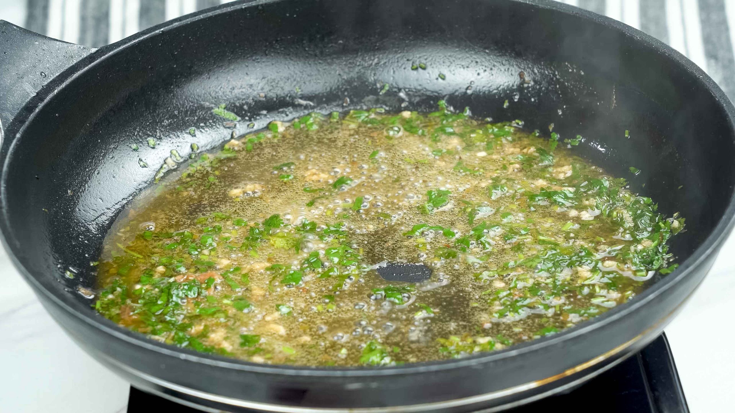 In the same pan, add vegetable broth, garlic, thyme, and balsamic vinegar and butter. Add lemon juice and parsley.