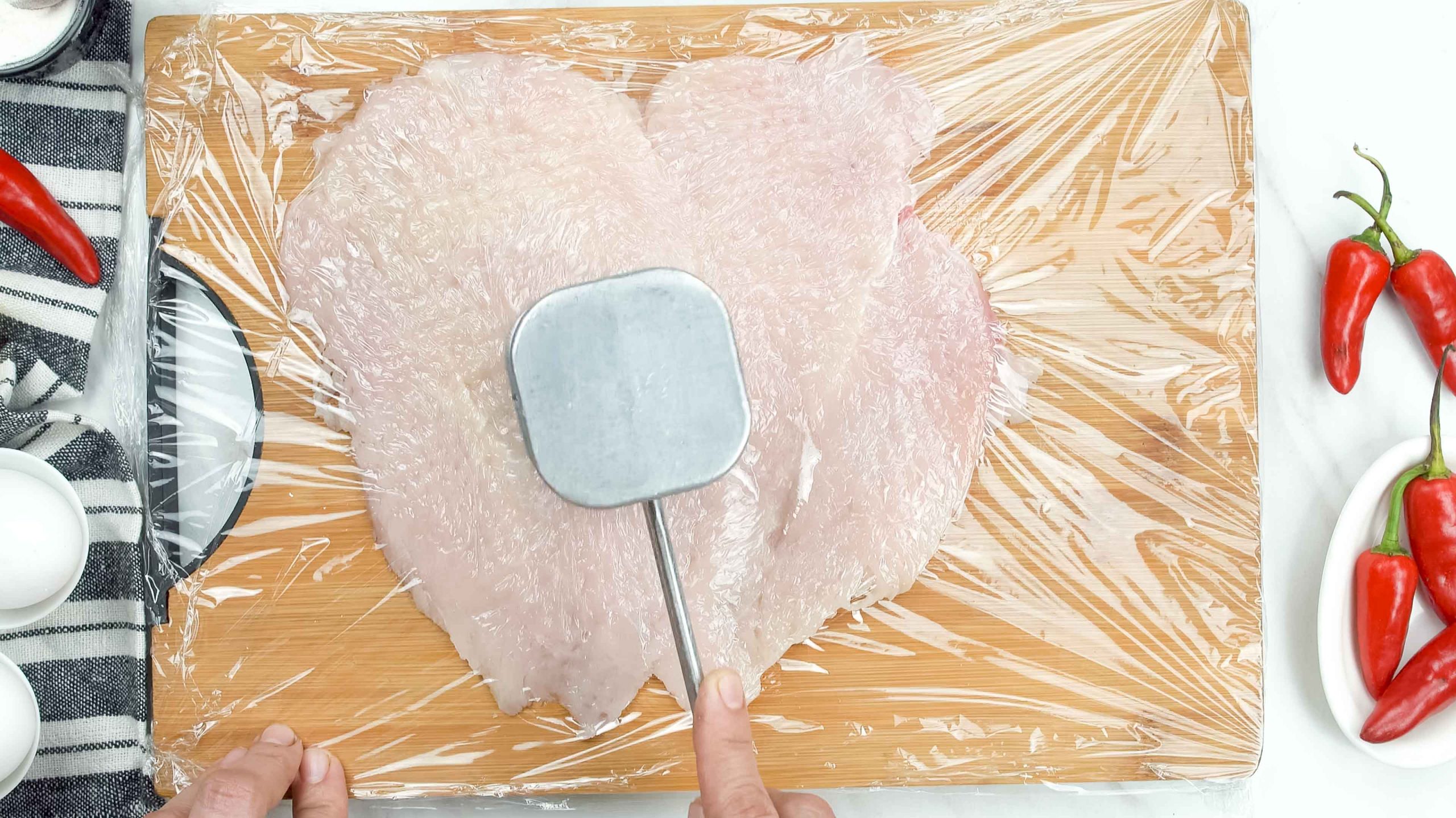 Flatten one chicken breast using a mallet or rolling pin.