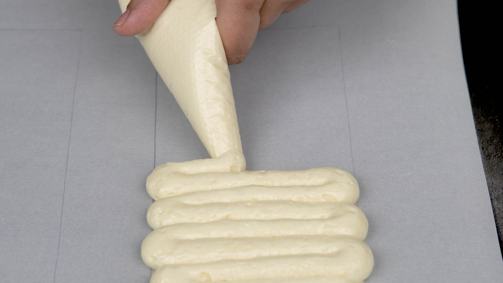Pipe a thin layer onto parchment, slightly larger than your mold shape—dust lightly with powdered sugar.