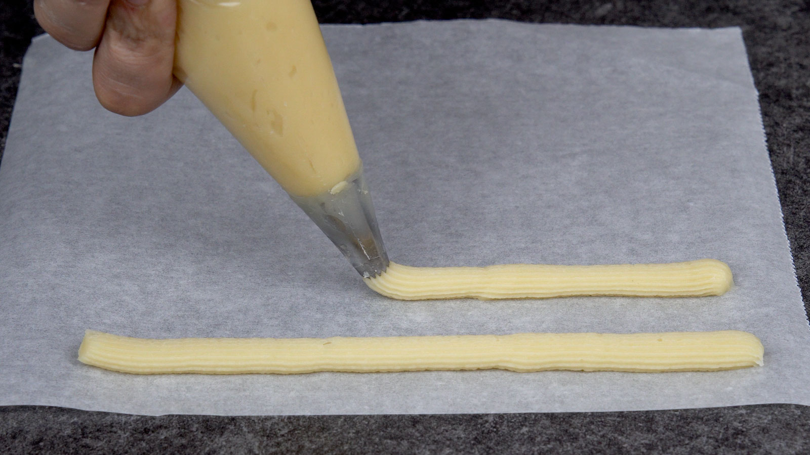 Fit your piping bag with a French star tip (โค10 mm) and fill it with dough.