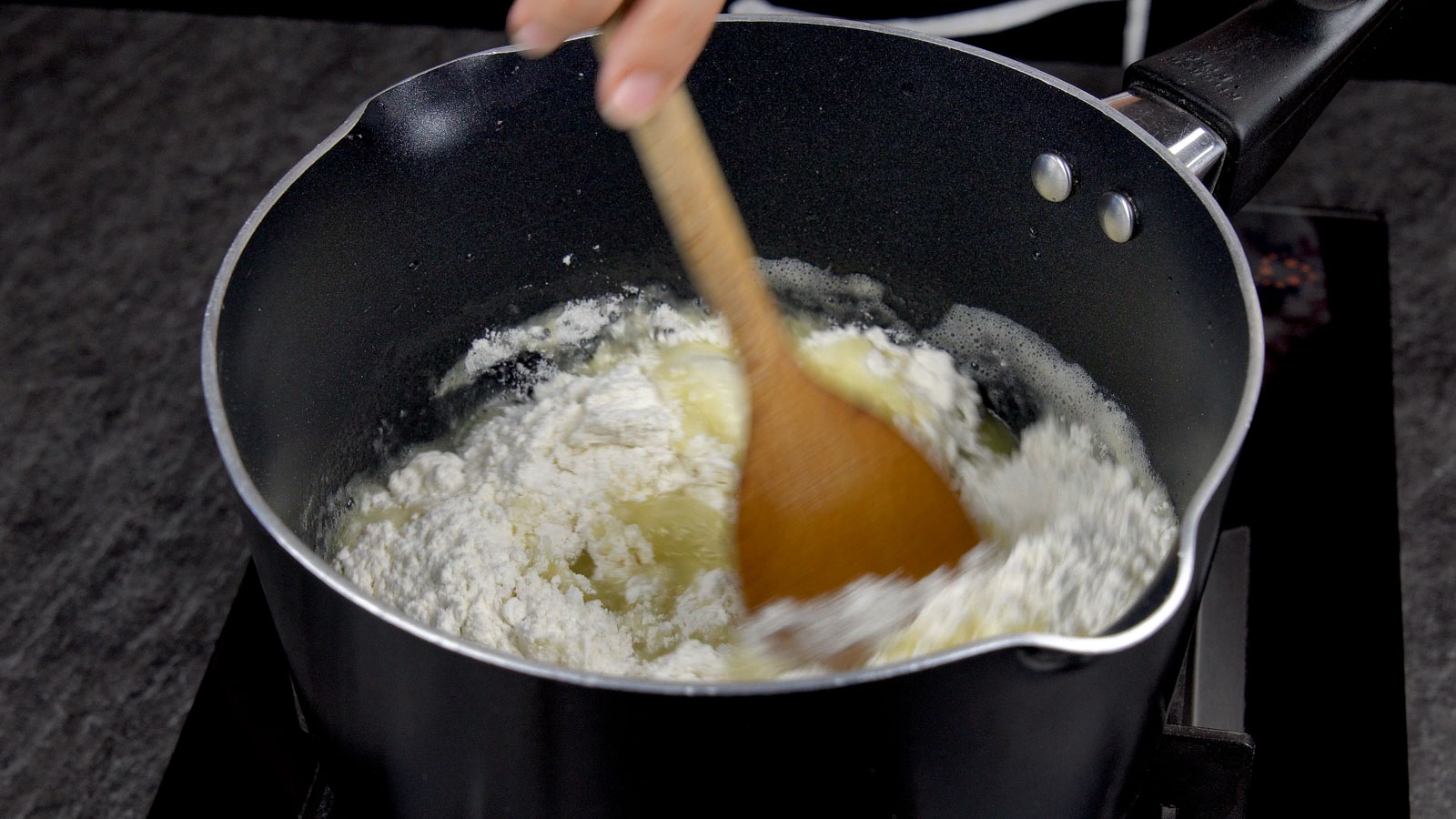 Once boiling, immediately add flour all at once.