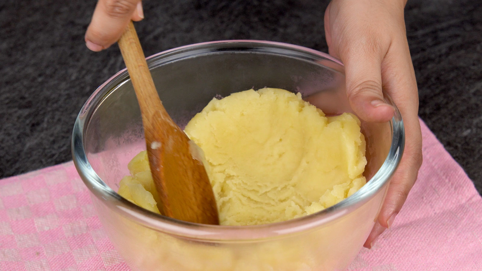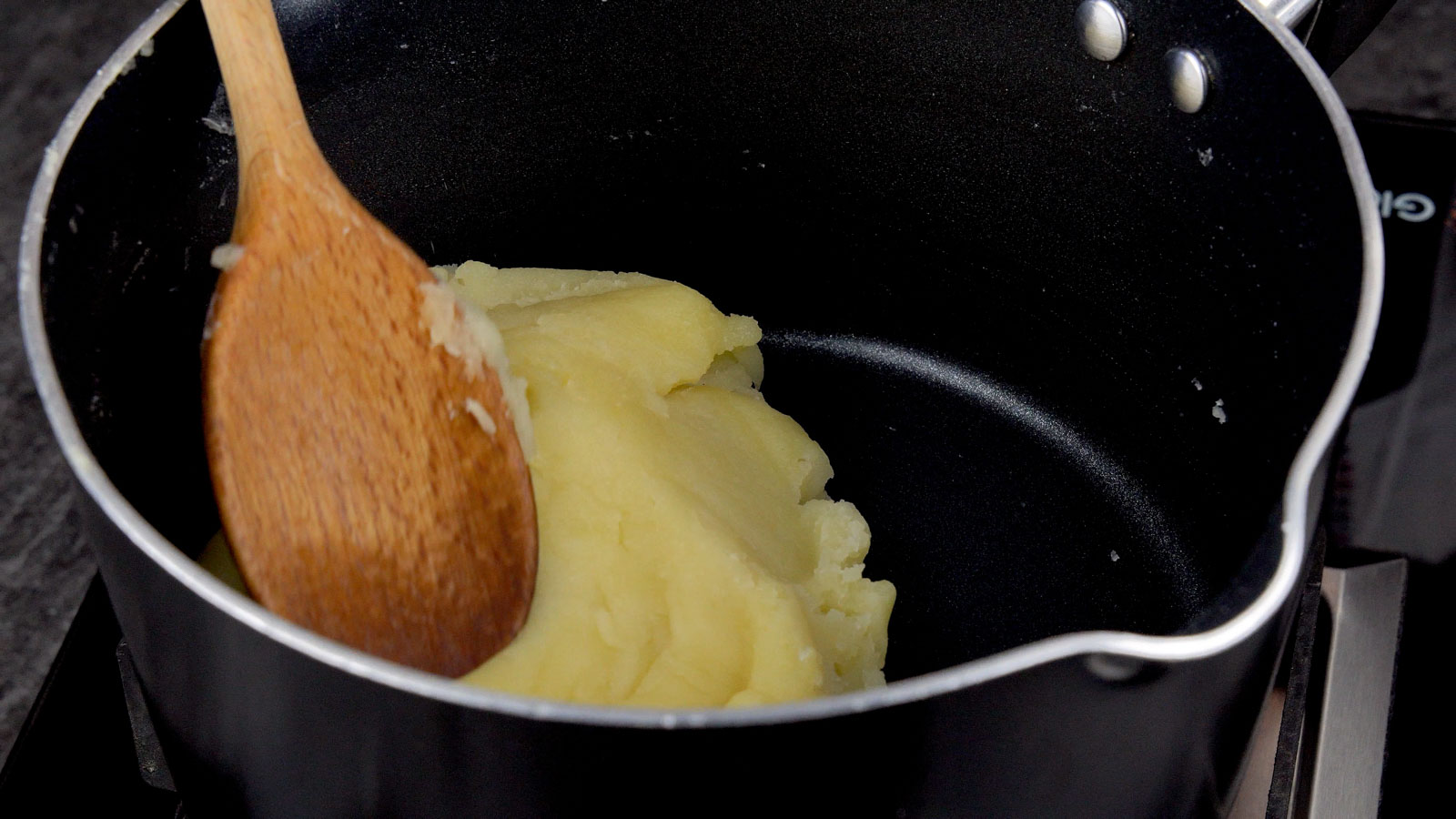 Stir fast and continuously with a wooden spoon until it forms a smooth dough that pulls away from the potโs sides.