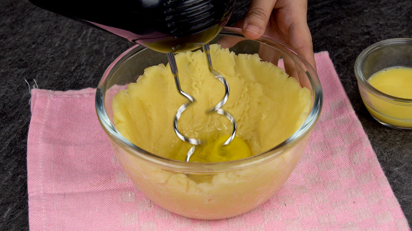 Crack the egg in the dough bowl and start mixing with an electric mixer until well combined.