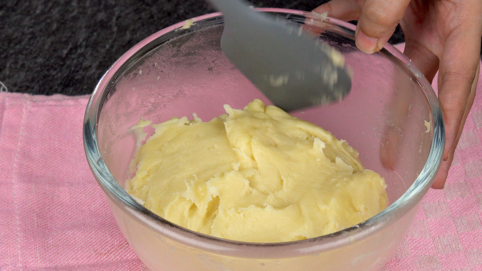 Gradually add the beaten egg to the dough โ a little at a time โ stirring after each addition.