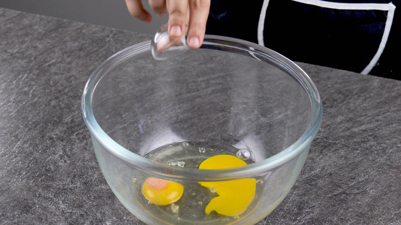 Crack the eggs into a mixing bowl and add a pinch of salt. Whisk them until slightly foamy — this step helps incorporate air into the batter, making the cake lighter.